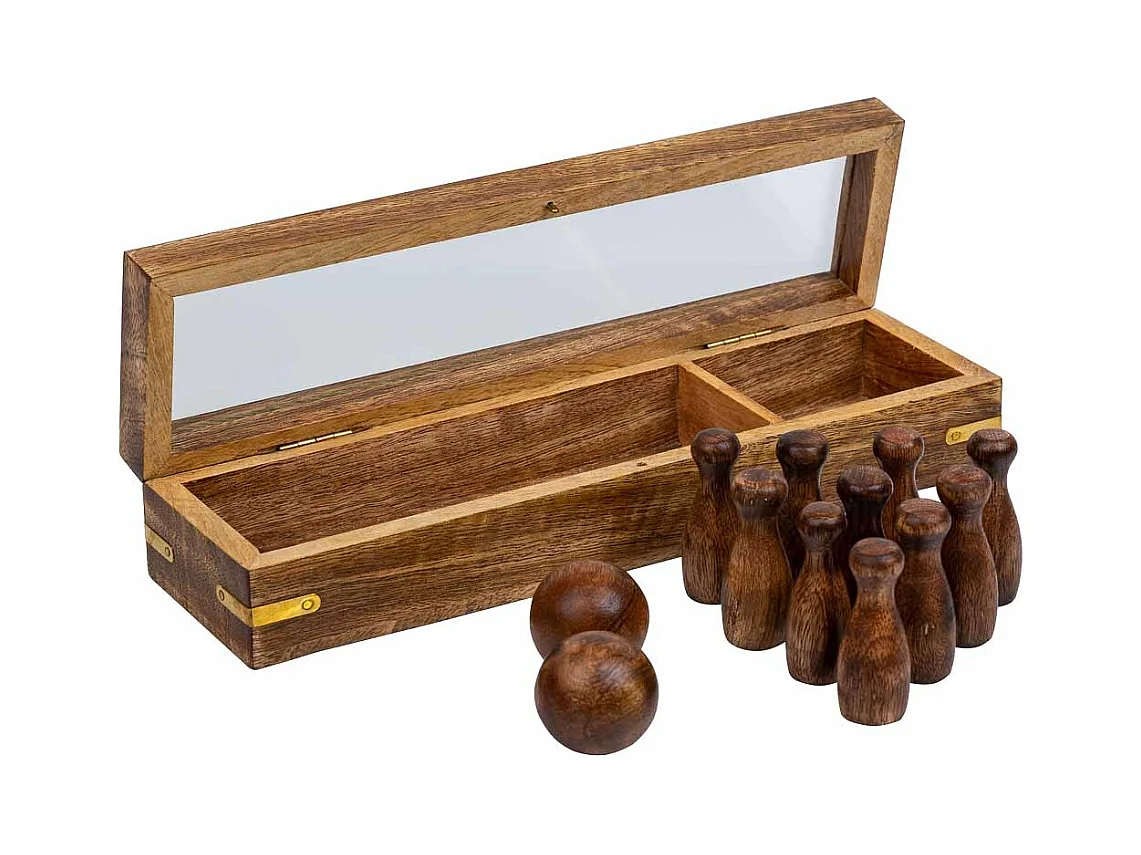 Bowlingspiel (10 Teile + 2 Kugeln) in brauner Holzkiste 25,5x7x5h cm