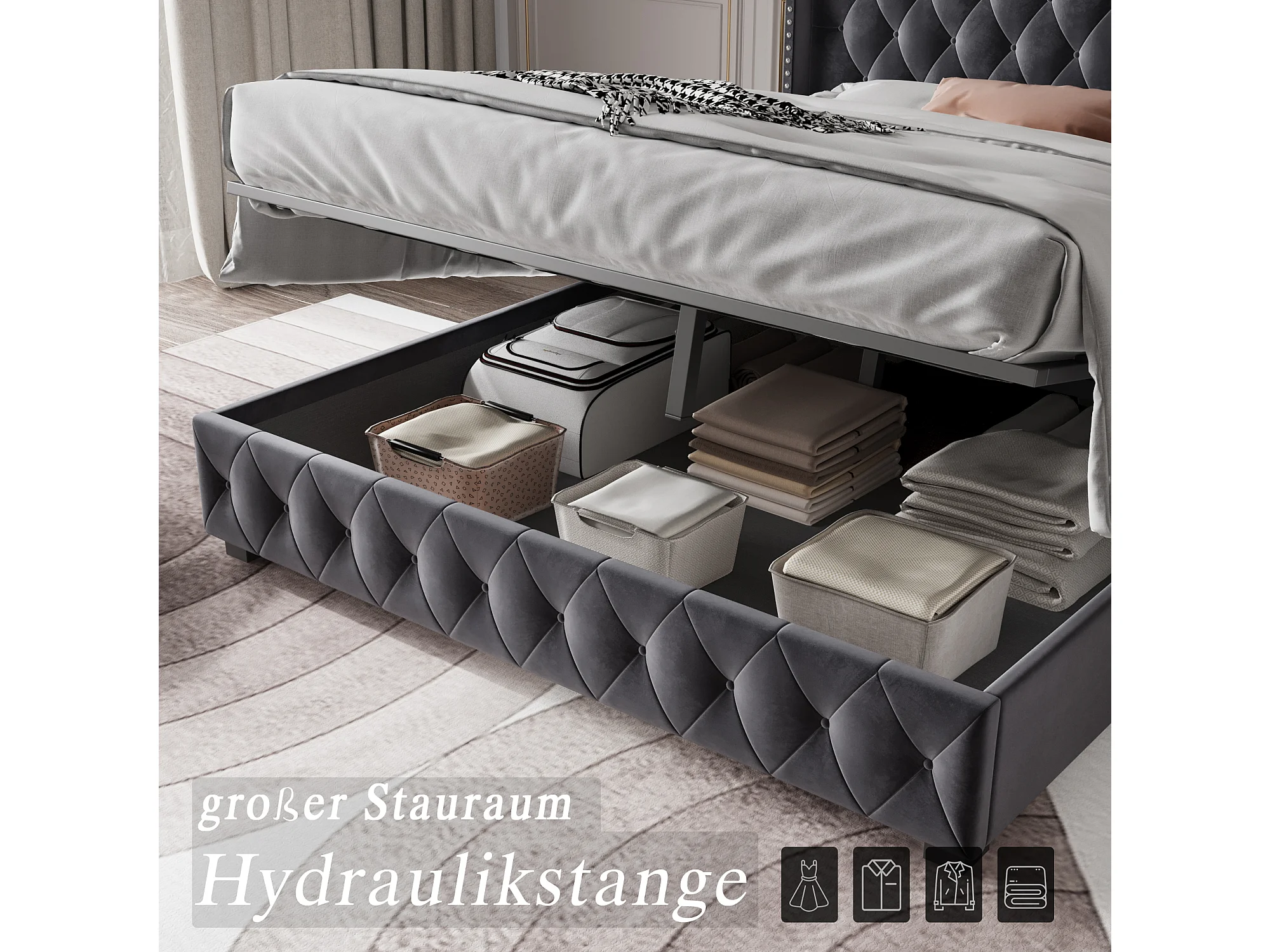 Boxbett mit Samtbezug – verziert mit Nieten – mit Lattenrost – 140 x 200 cm – Grau