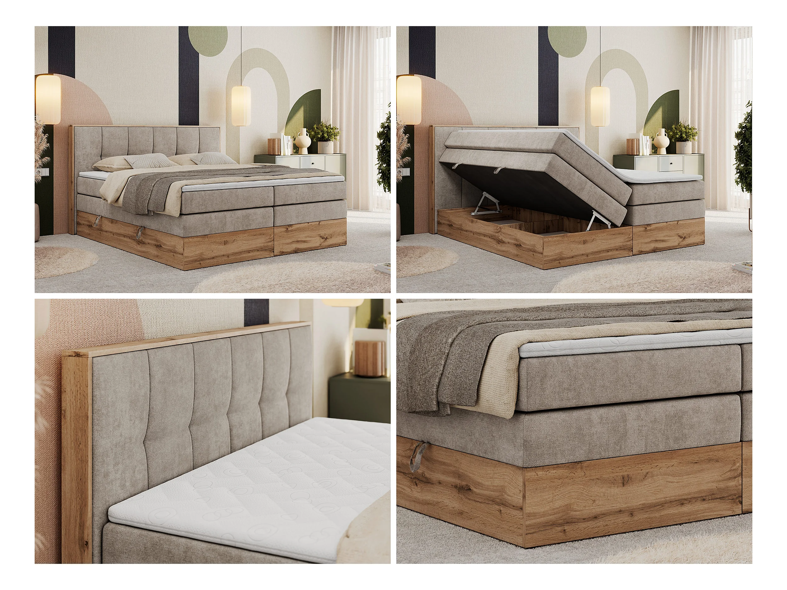 Boxspringbett ALBERO 1 KING - zwei 7 Härtezonen Multipocket-Matratzen, Doppelbett mit Stauraum, Eiche Wotan Holzrahmen - 120x200 cm - H4 - Beige Strukture