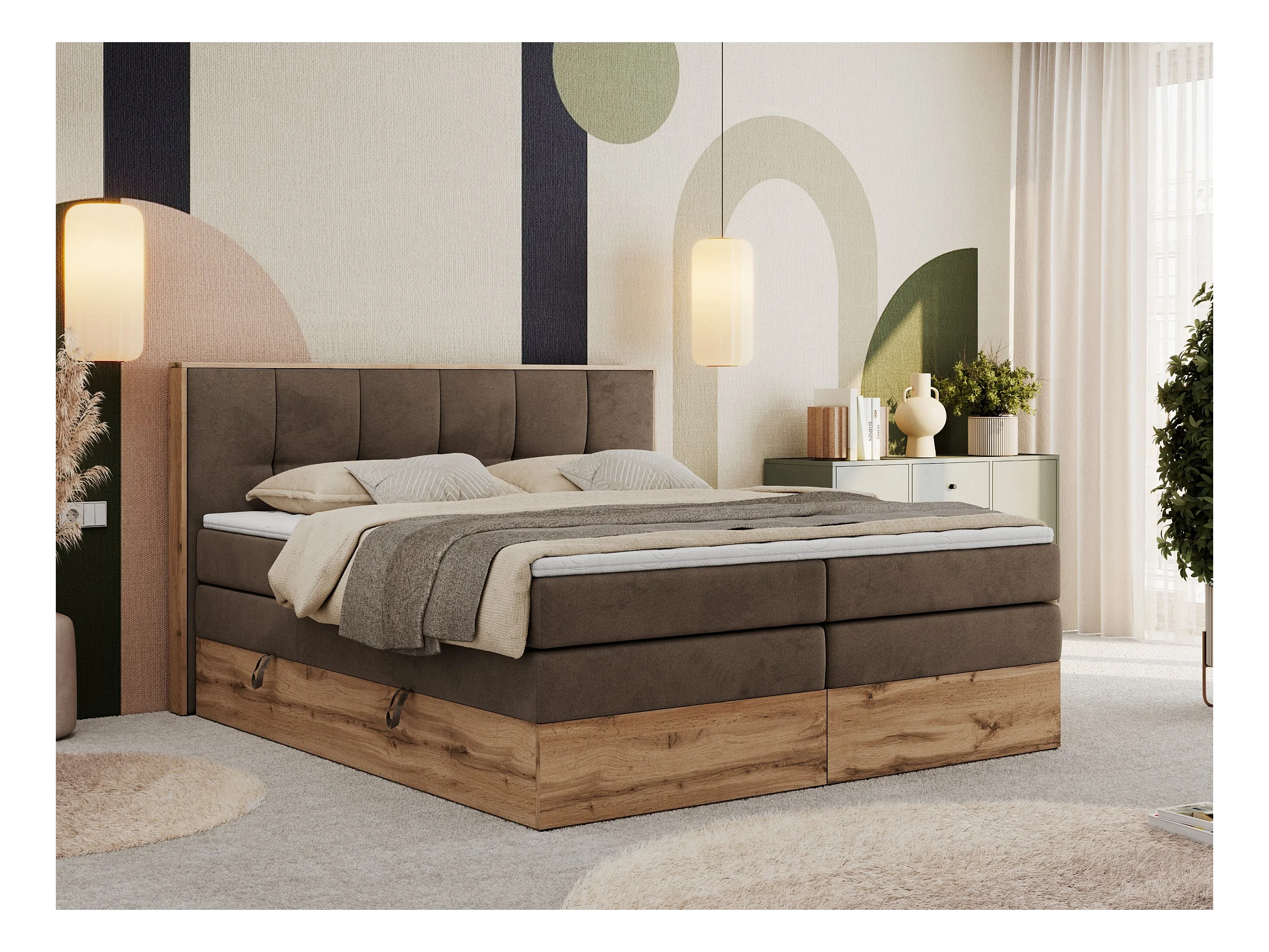 Boxspringbett ALBERO 1 KING - zwei 7 Härtezonen Multipocket-Matratzen, Doppelbett mit Stauraum, Eiche Wotan Holzrahmen - 160x200 cm - H4 - Braun Velvet