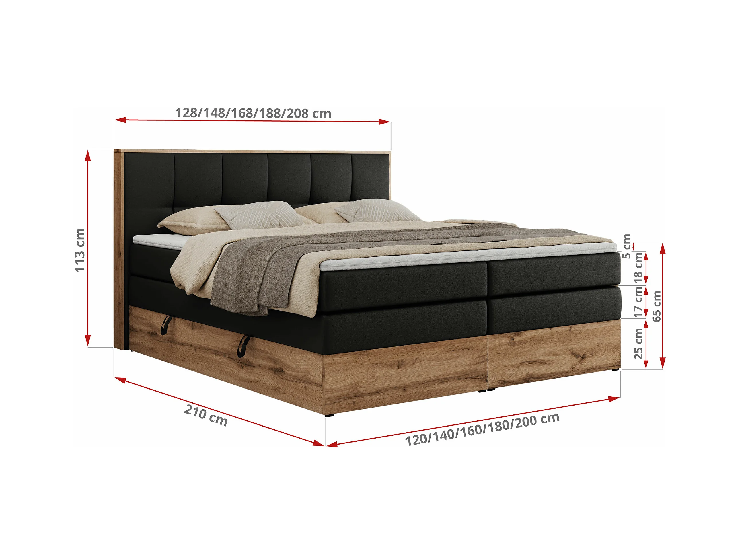 Boxspringbett ALBERO 1 KING - zwei 7 Härtezonen Multipocket-Matratzen, Doppelbett mit Stauraum, Eiche Wotan Holzrahmen - 160x200 cm - H4 - Schwarz Kunstleder