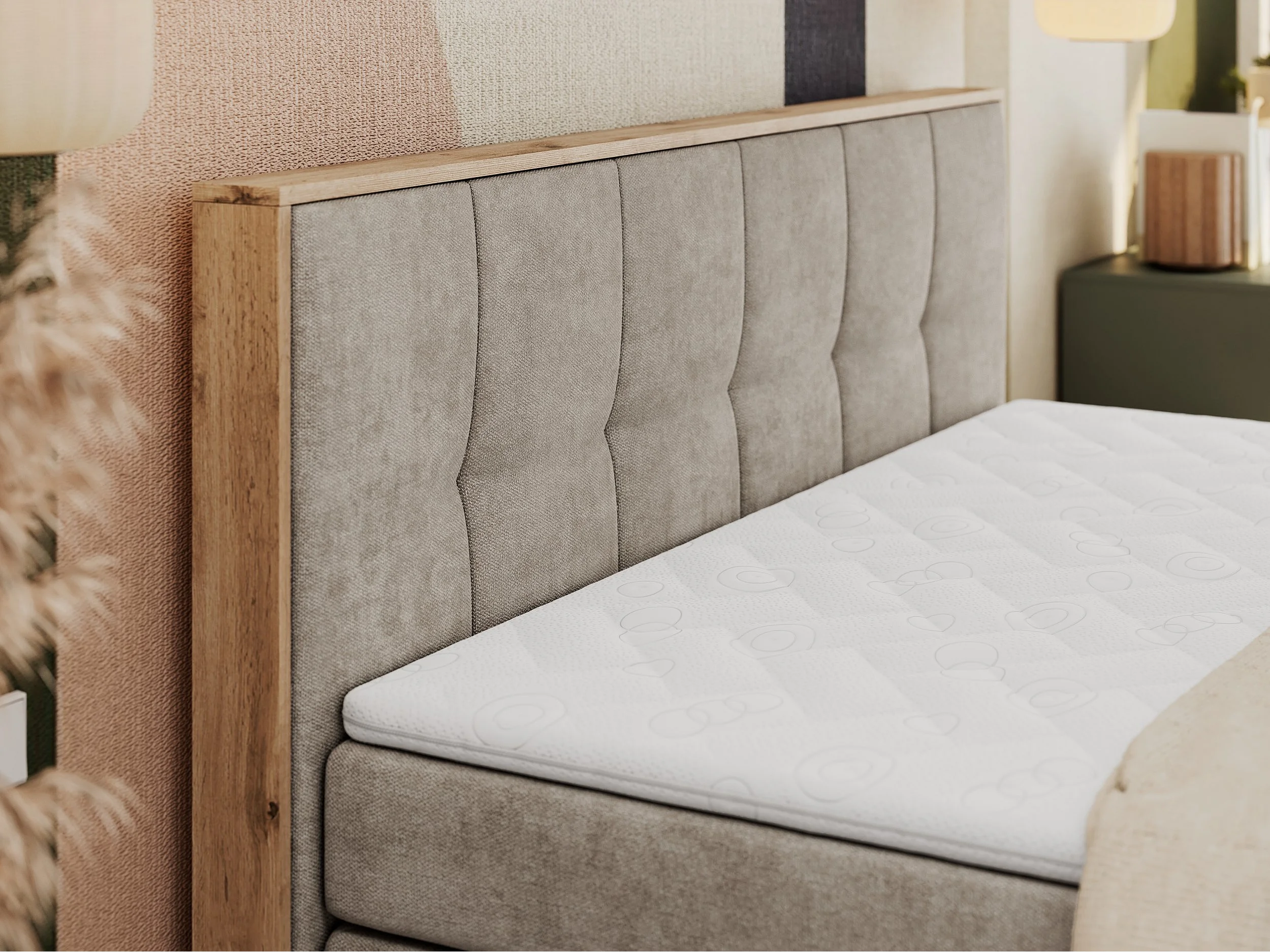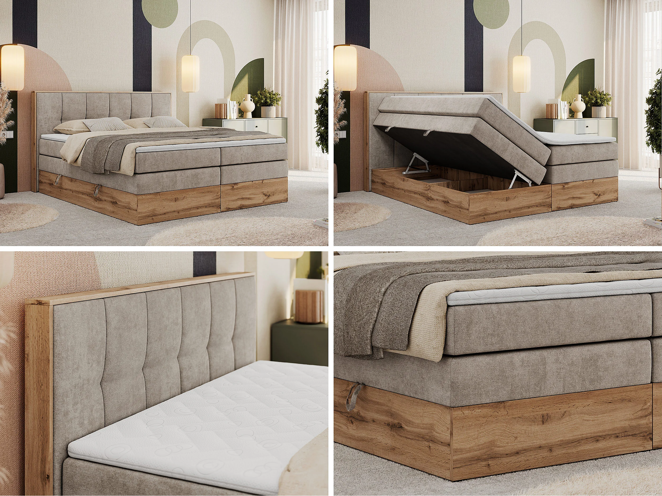 Boxspringbett ALBERO 1 KING - zwei 7 Härtezonen Multipocket-Matratzen, Doppelbett mit Stauraum, Eiche Wotan Holzrahmen - 180x200 cm - H4 - Beige Strukture