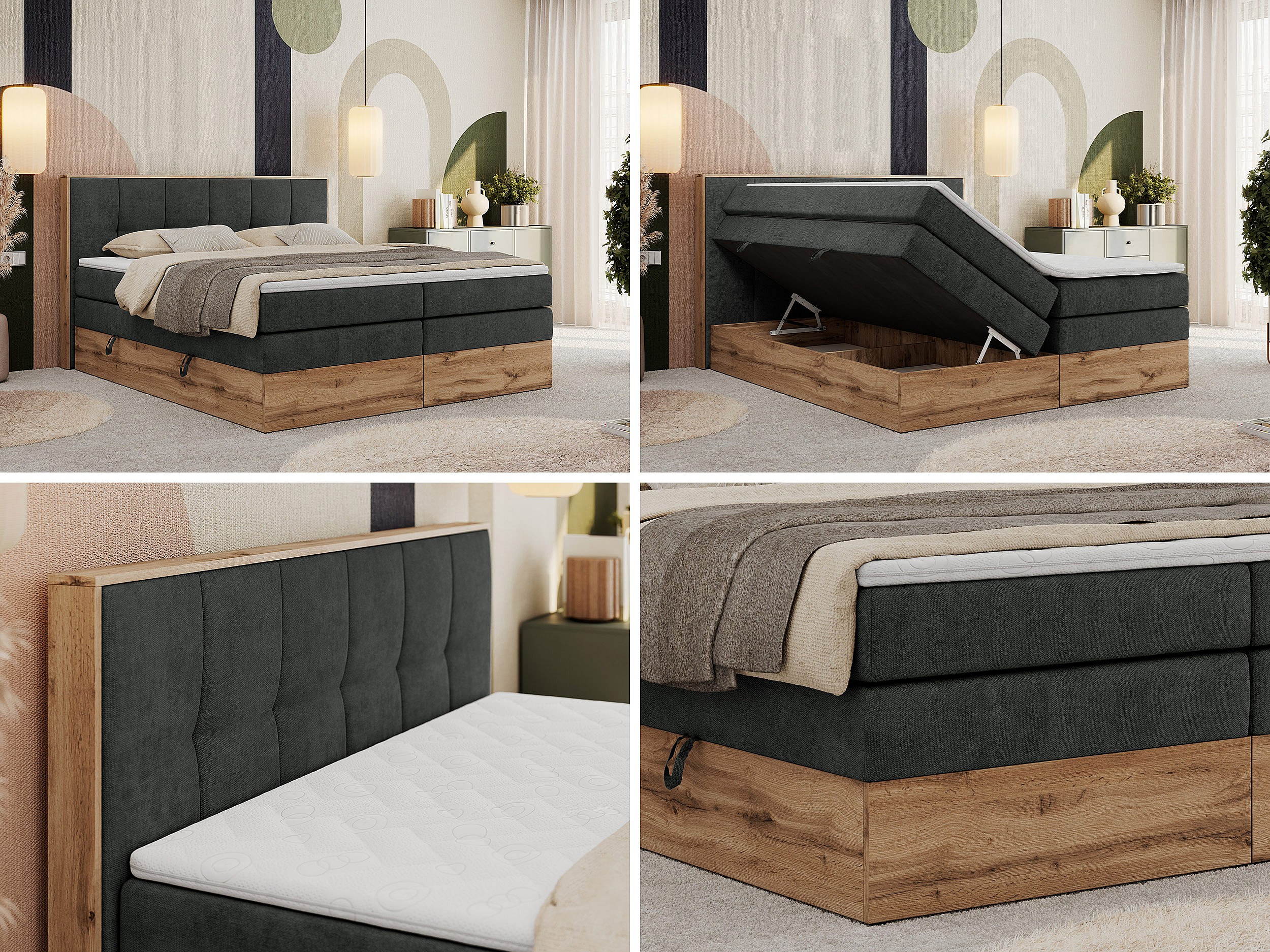 Boxspringbett ALBERO 1 KING - zwei 7 Härtezonen Multipocket-Matratzen, Doppelbett mit Stauraum, Eiche Wotan Holzrahmen - 200x200 cm - H4 - Dunkelgrau Strukture