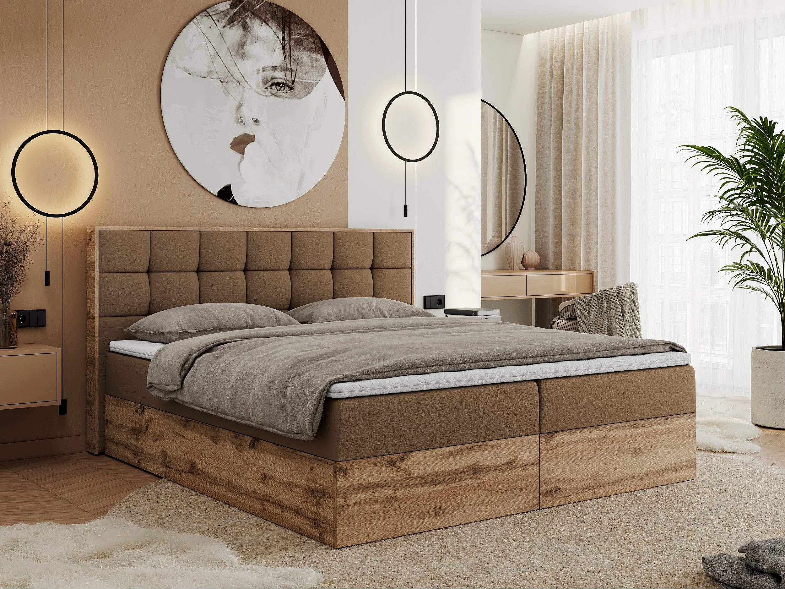 Boxspringbett ALBERO 1, Polsterbett mit gestepptem Kopfteil, Multipocket-Matratze - 140x200 cm - H4 - Braun Kunstleder
