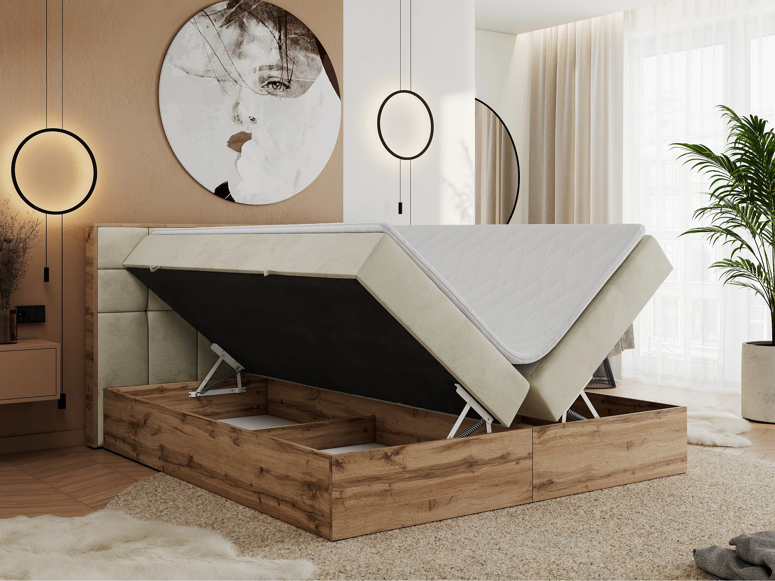 Boxspringbett ALBERO 1, Polsterbett mit gestepptem Kopfteil, Multipocket-Matratze - 160x200 cm - H4 - Beige Velvet