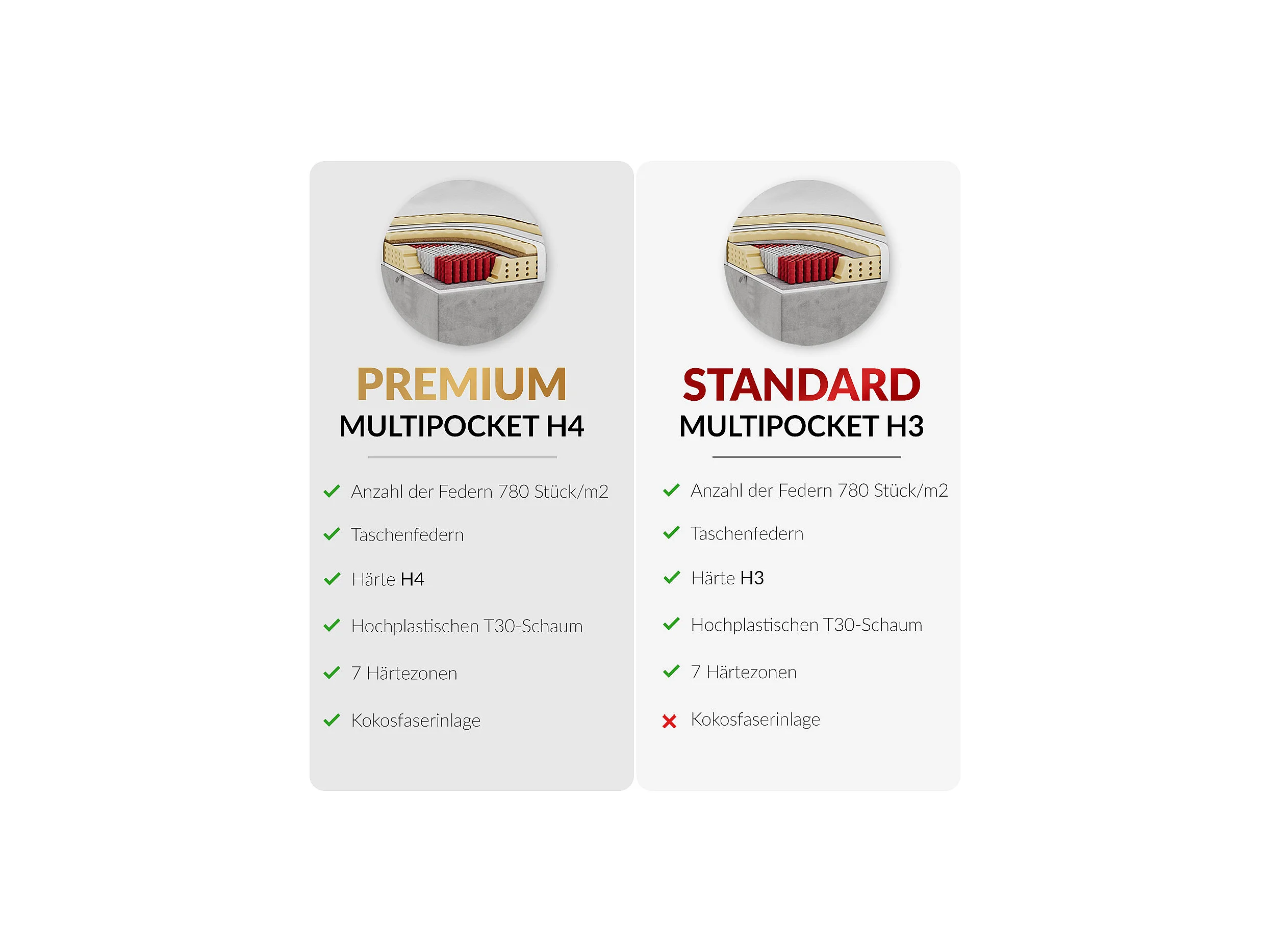 Boxspringbett ALBERO 1, Polsterbett mit gestepptem Kopfteil, Multipocket-Matratze - 160x200 cm - H4 - Dunkelgrau Strukture