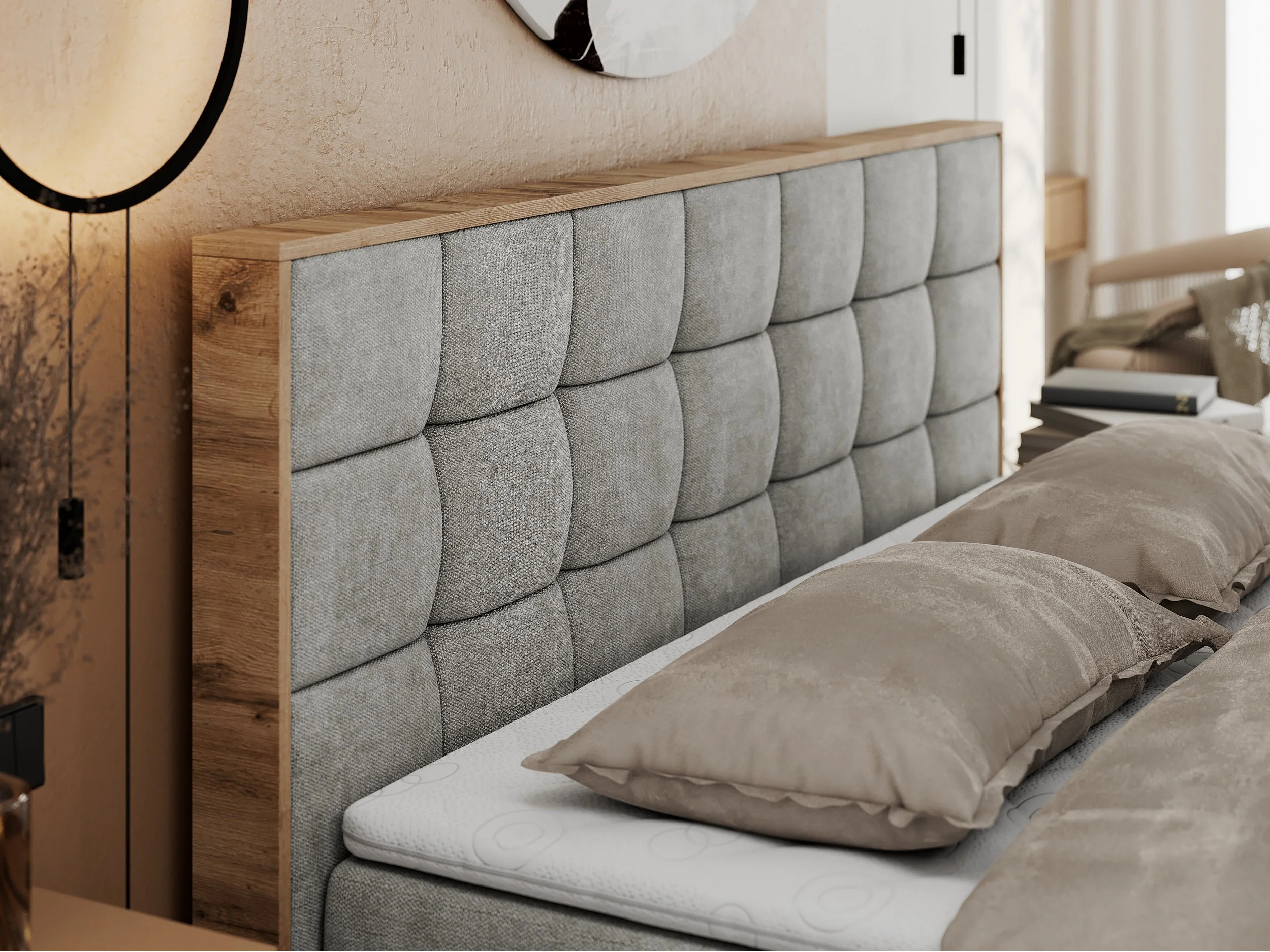 Boxspringbett ALBERO 1, Polsterbett mit gestepptem Kopfteil, Multipocket-Matratze - 200x200 cm - H4 - Hellgrau Strukture