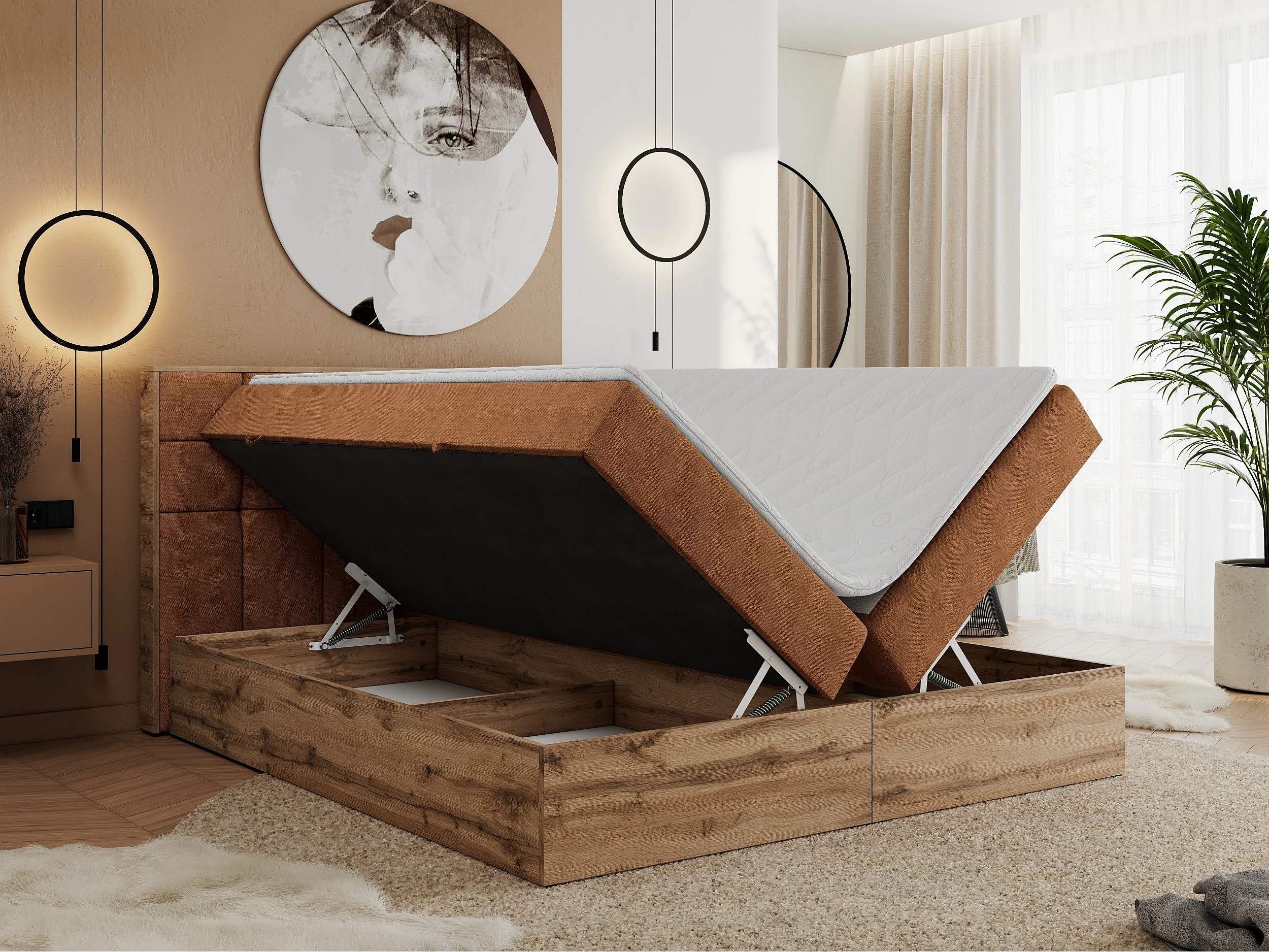 Boxspringbett ALBERO 1, Polsterbett mit gestepptem Kopfteil, Multipocket-Matratze - 200x200 cm - H4 - Orange Strukture