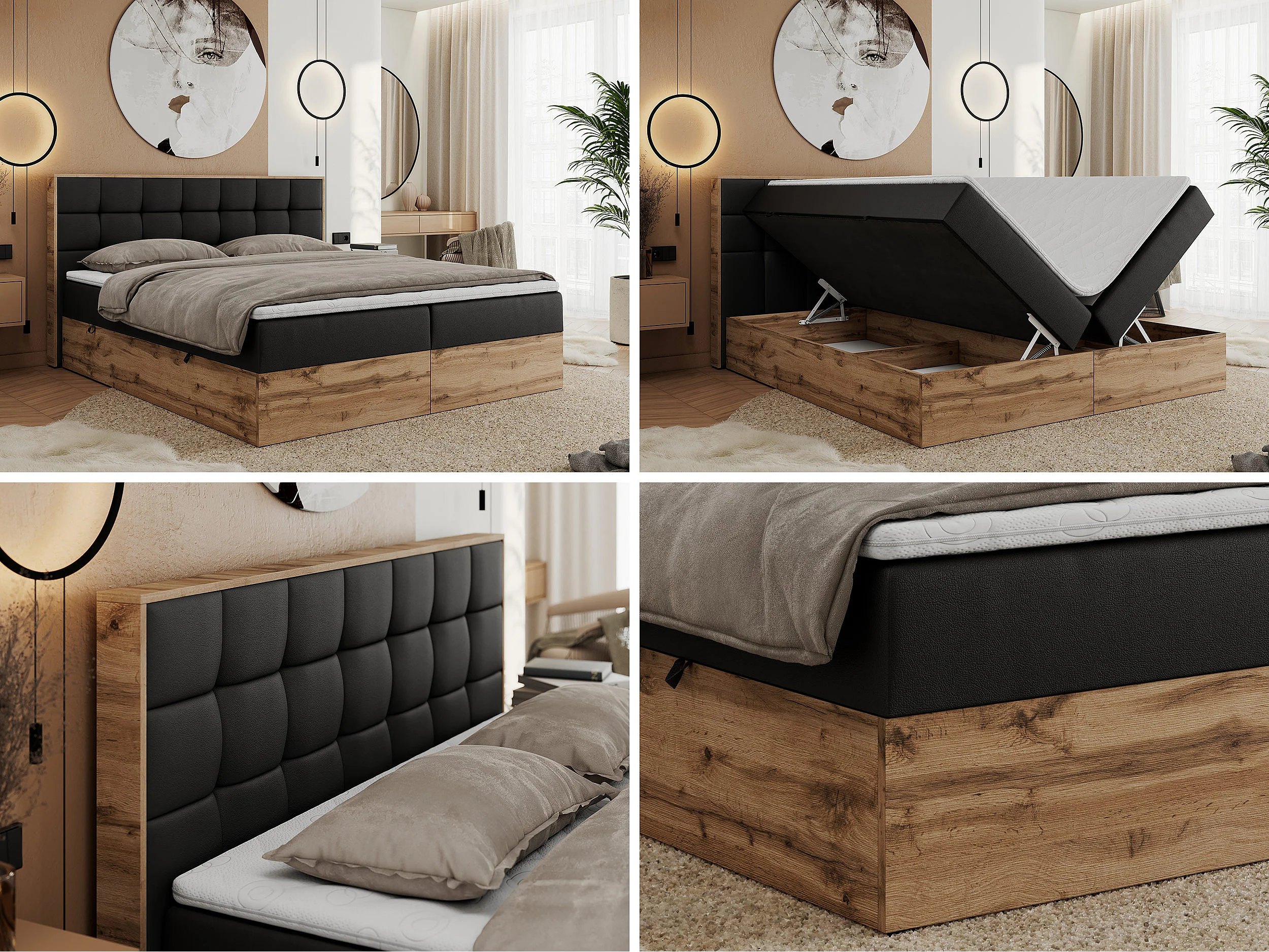 Boxspringbett ALBERO 1, Polsterbett mit gestepptem Kopfteil, Multipocket-Matratze - 200x200 cm - H4 - Schwarz Kunstleder