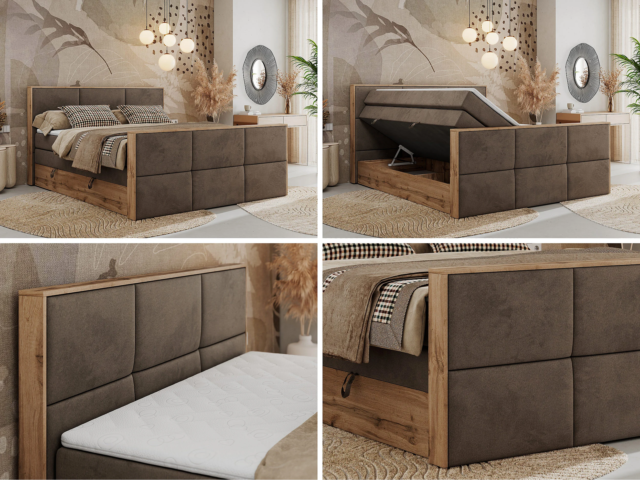 Boxspringbett ALBERO 2 KING DUO - Eiche Wotan Holzrahmen, zwei Multipocket-Matratzen, Bettkästen - 160x200 cm - H3 - Braun Velvet