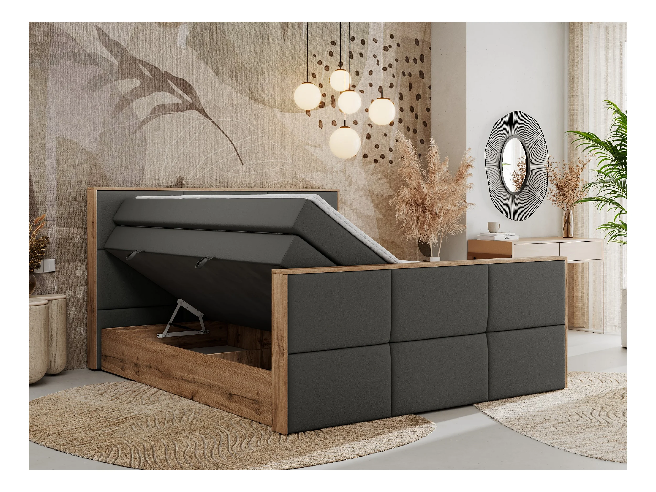 Boxspringbett ALBERO 2 KING DUO - Eiche Wotan Holzrahmen, zwei Multipocket-Matratzen, Bettkästen - 200x200 cm - H3 - Dunkelgrau Kunstleder