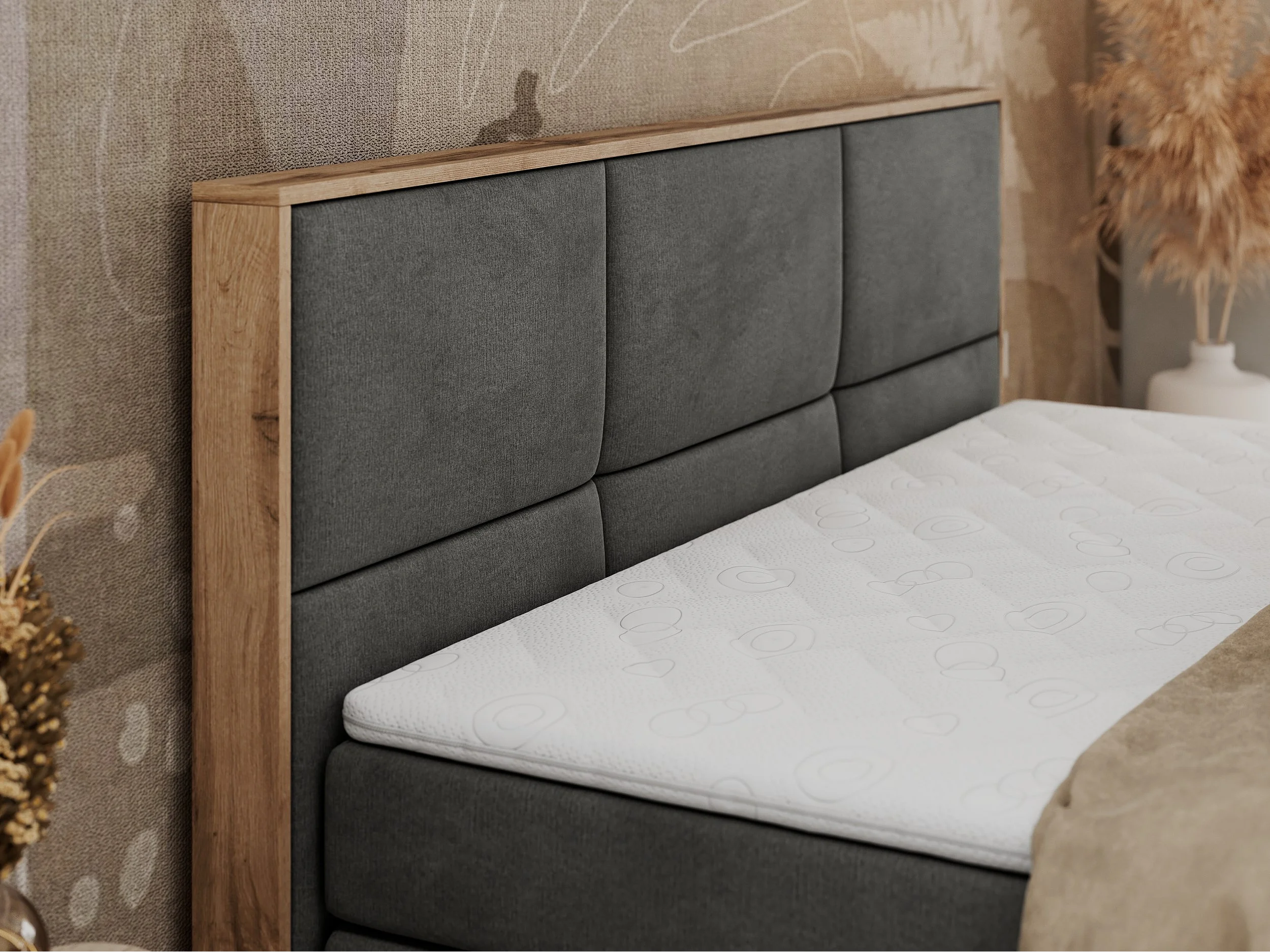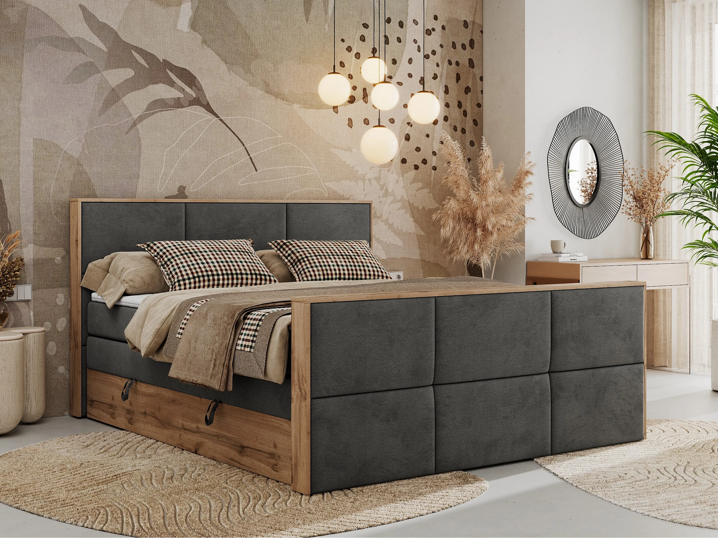Boxspringbett ALBERO 2 KING DUO - Eiche Wotan Holzrahmen, zwei Multipocket-Matratzen, Bettkästen - 200x200 cm - H3 - Dunkelgrau Velvet