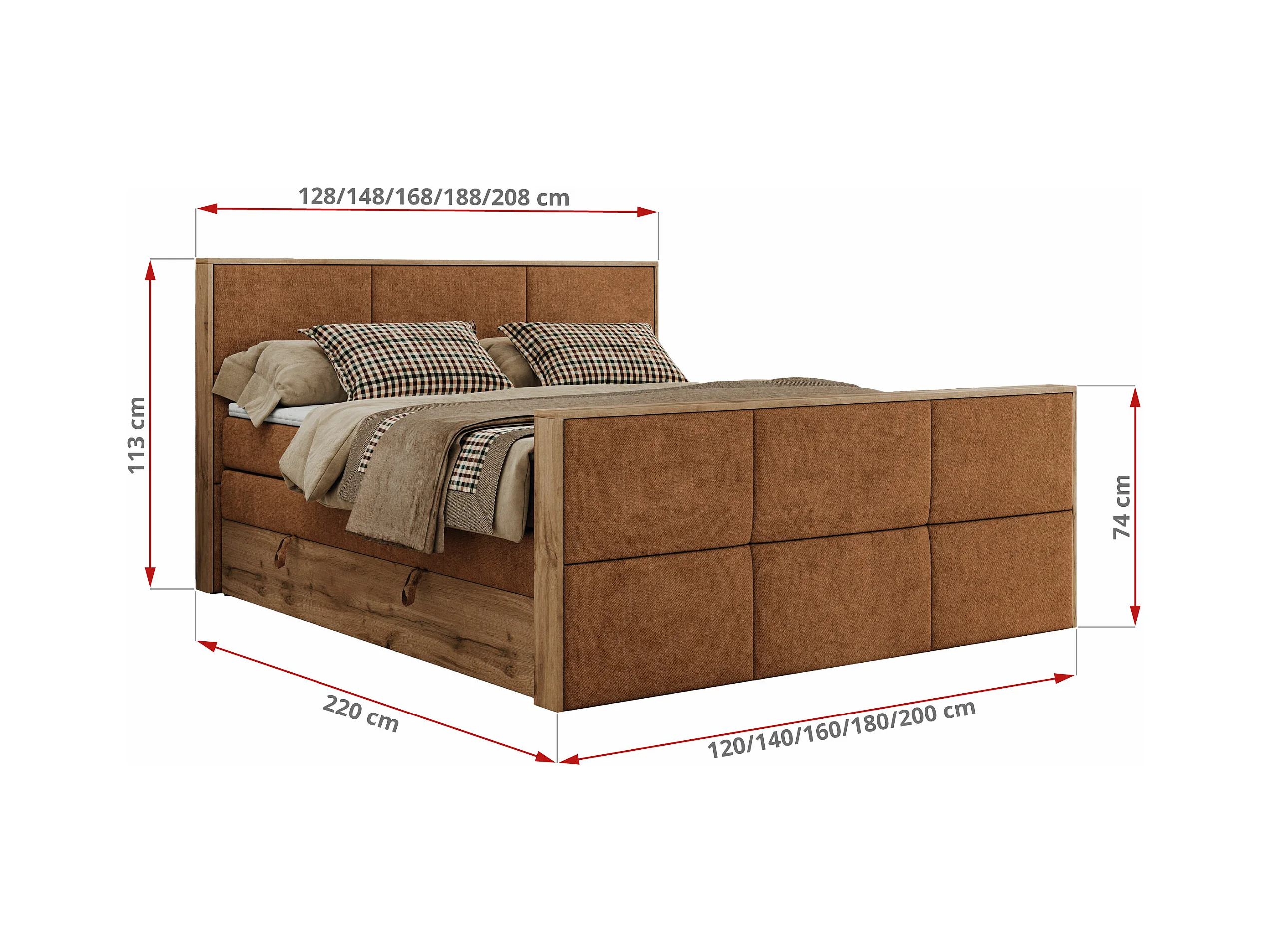 Boxspringbett ALBERO 2 KING DUO - Eiche Wotan Holzrahmen, zwei Multipocket-Matratzen, Bettkästen - 200x200 cm - H4 - Orange Strukture