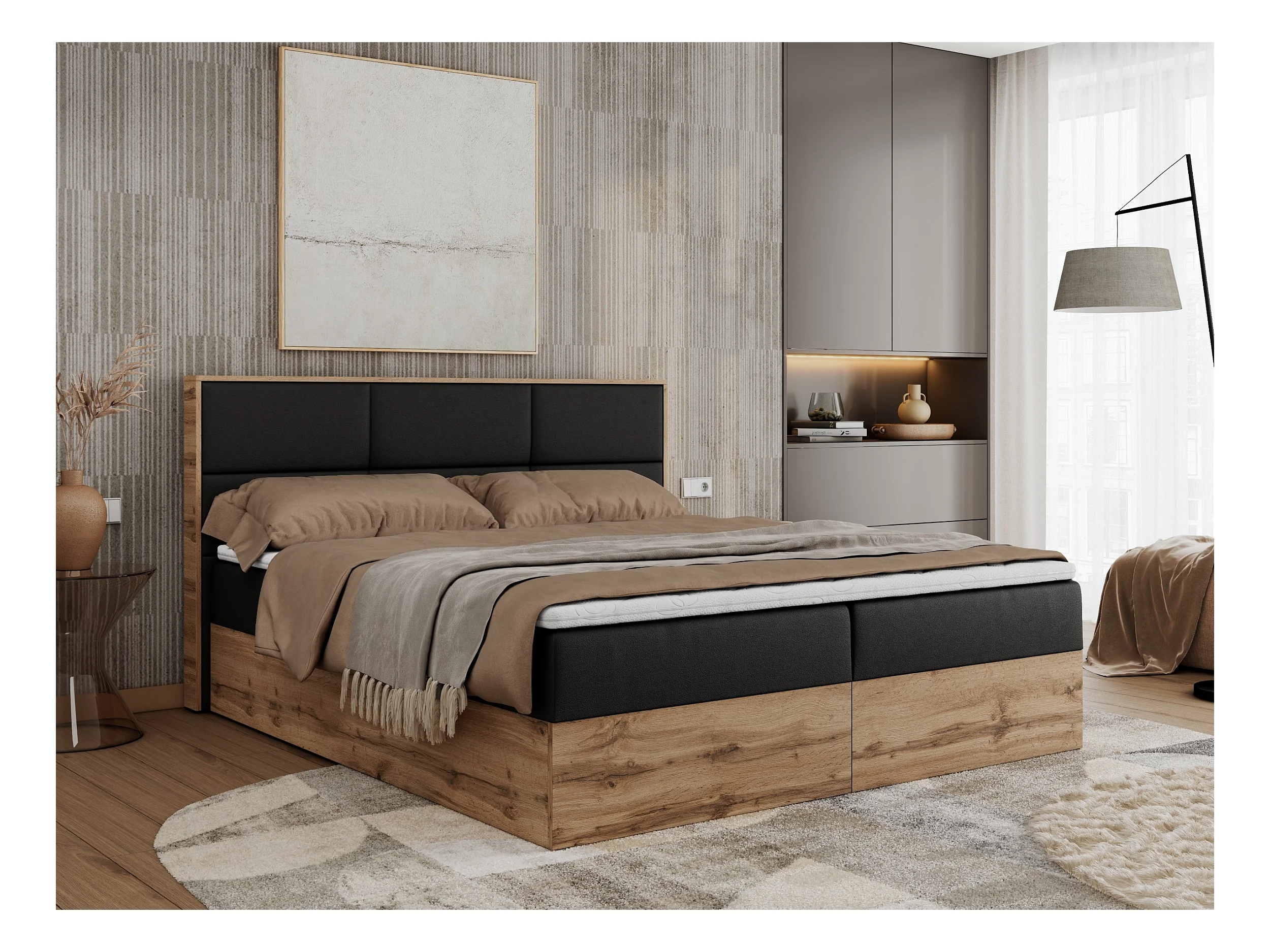 Boxspringbett ALBERO 2 mit Topper und Multipocket-Matratze, Stauraum, Holzrahmen - 140x200 cm - H4 - Schwarz Kunstleder