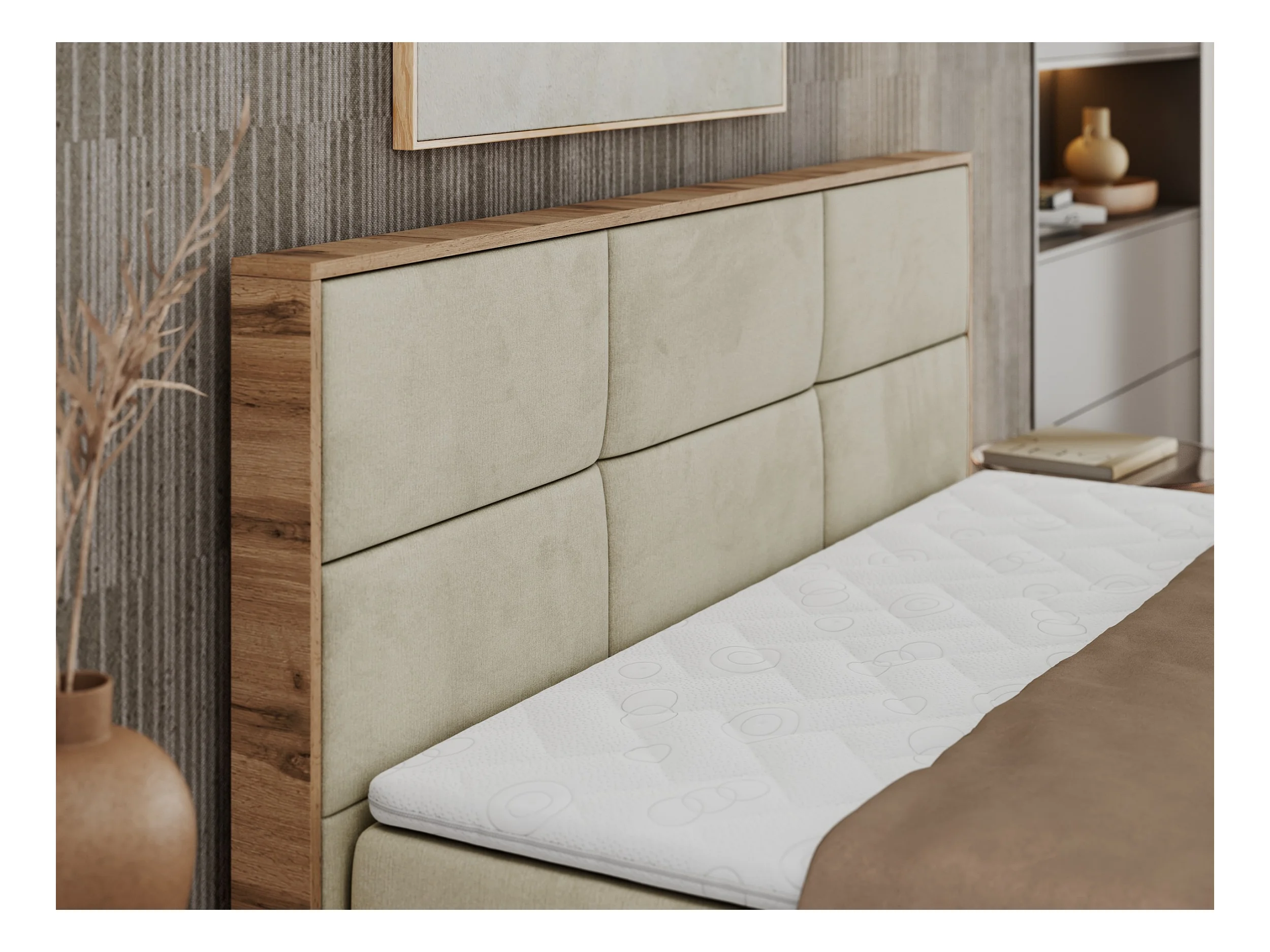 Boxspringbett ALBERO 2 mit Topper und Multipocket-Matratze, Stauraum, Holzrahmen - 160x200 cm - H3 - Beige Velvet