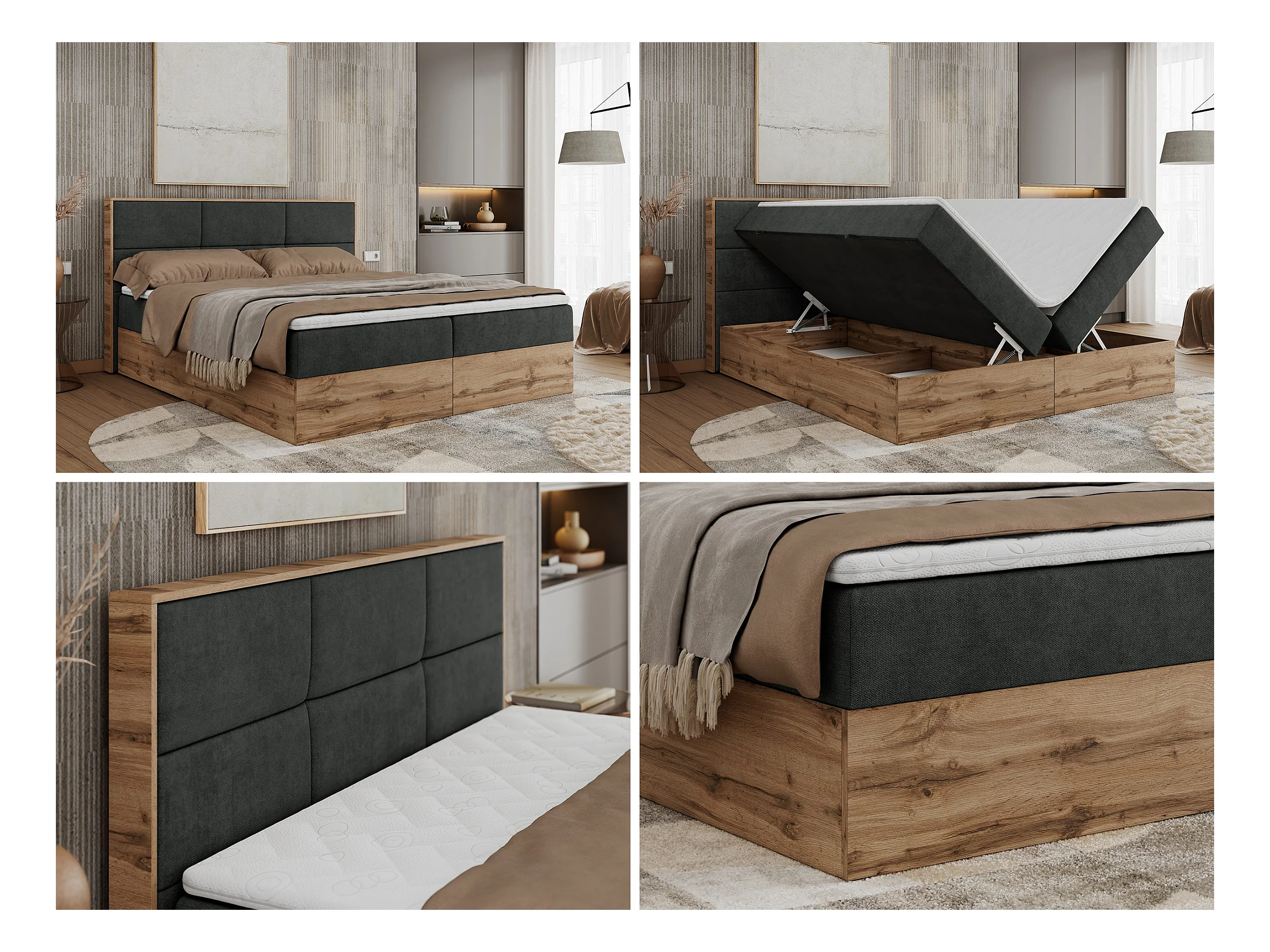 Boxspringbett ALBERO 2 mit Topper und Multipocket-Matratze, Stauraum, Holzrahmen - 160x200 cm - H3 - Dunkelgrau Strukture