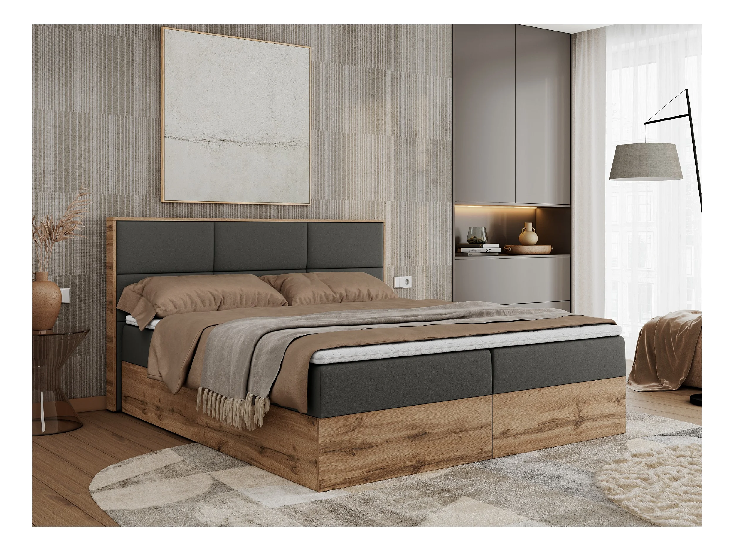 Boxspringbett ALBERO 2 mit Topper und Multipocket-Matratze, Stauraum, Holzrahmen - 180x200 cm - H3 - Dunkelgrau Kunstleder