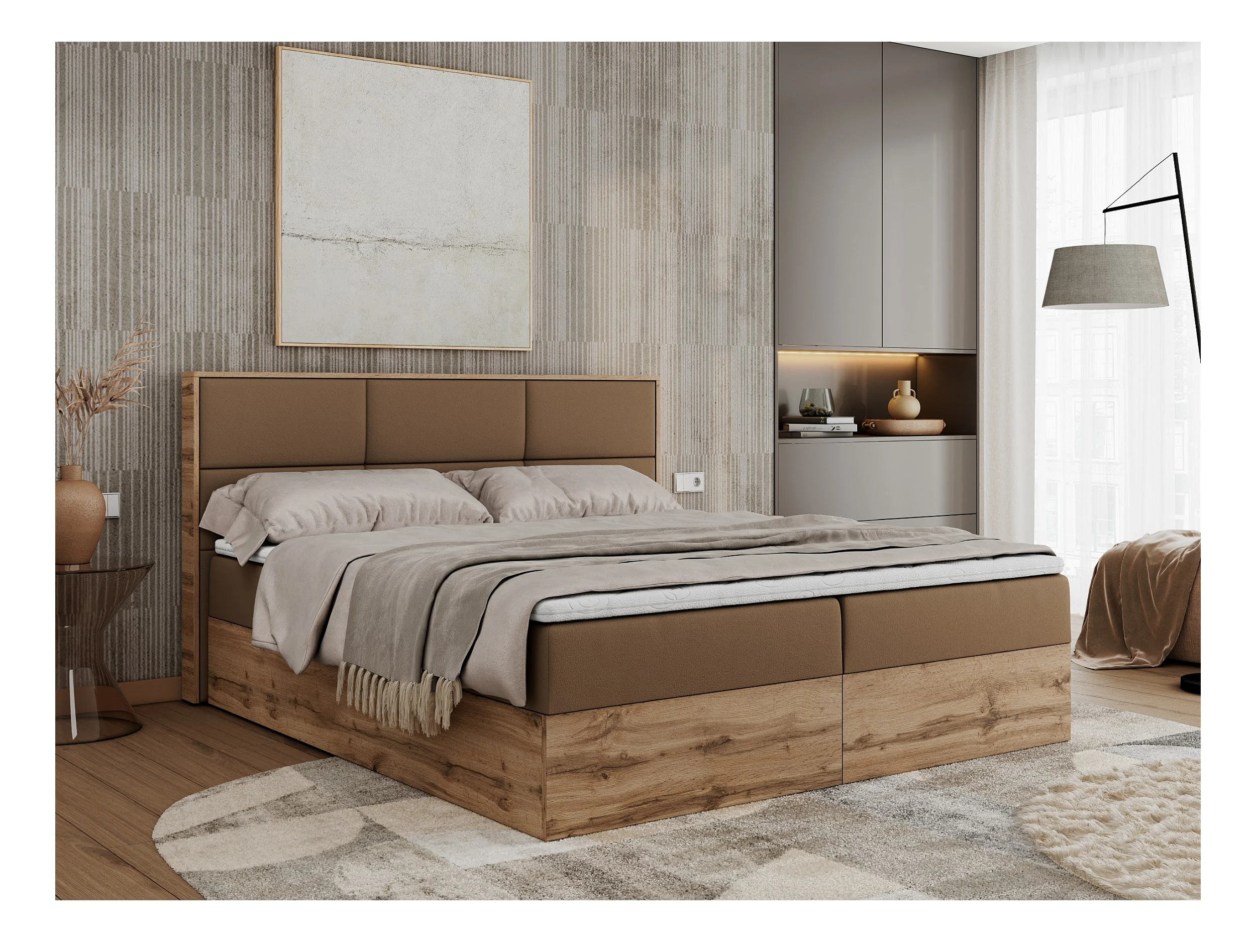 Boxspringbett ALBERO 2 mit Topper und Multipocket-Matratze, Stauraum, Holzrahmen - 200x200 cm - H3 - Braun Kunstleder