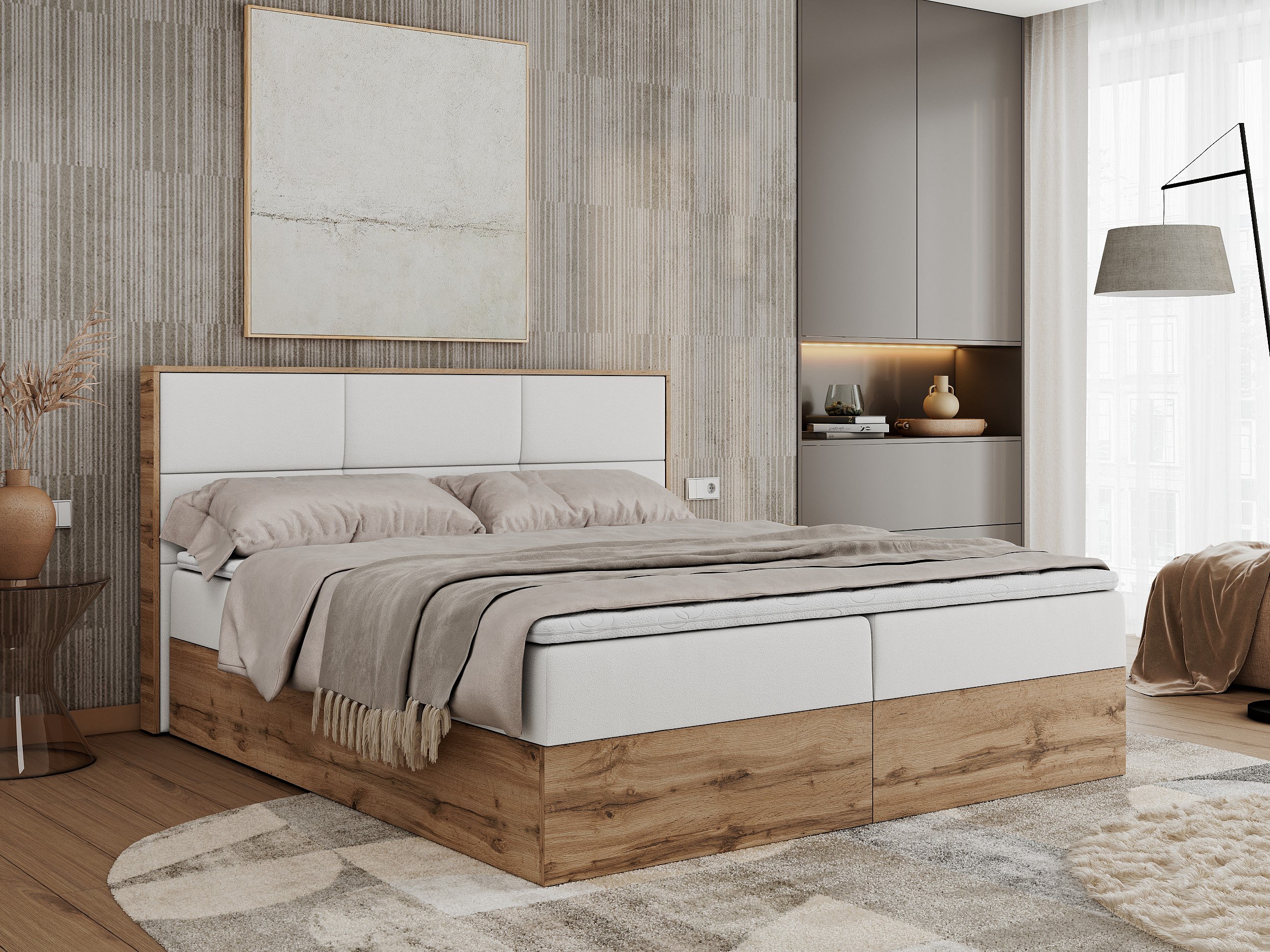 Boxspringbett ALBERO 2 mit Topper und Multipocket-Matratze, Stauraum, Holzrahmen - 200x200 cm - H4 - Weiß Kunstleder