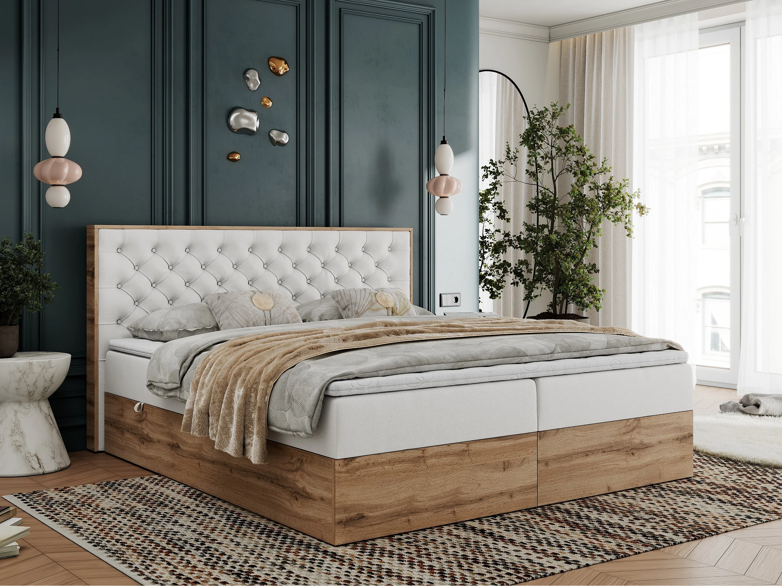 Boxspringbett ALBERO 3 - gesteppte Kopfstütze, Eiche Wotan Holzrahmen, Stauraum - 140x200 cm - H3 - Weiß Kunstleder