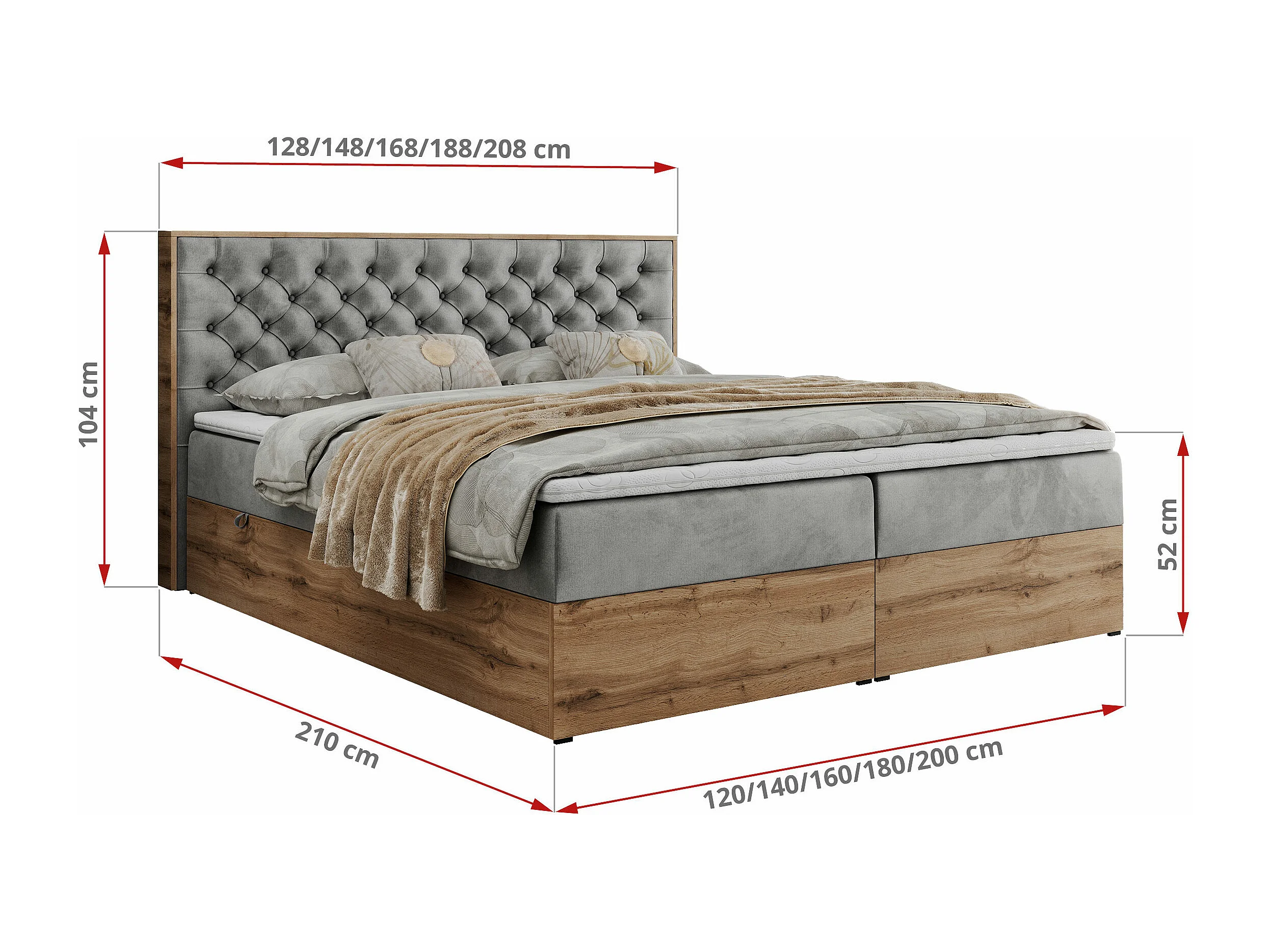 Boxspringbett ALBERO 3 - gesteppte Kopfstütze, Eiche Wotan Holzrahmen, Stauraum - 140x200 cm - H4 - Hellgrau Velvet