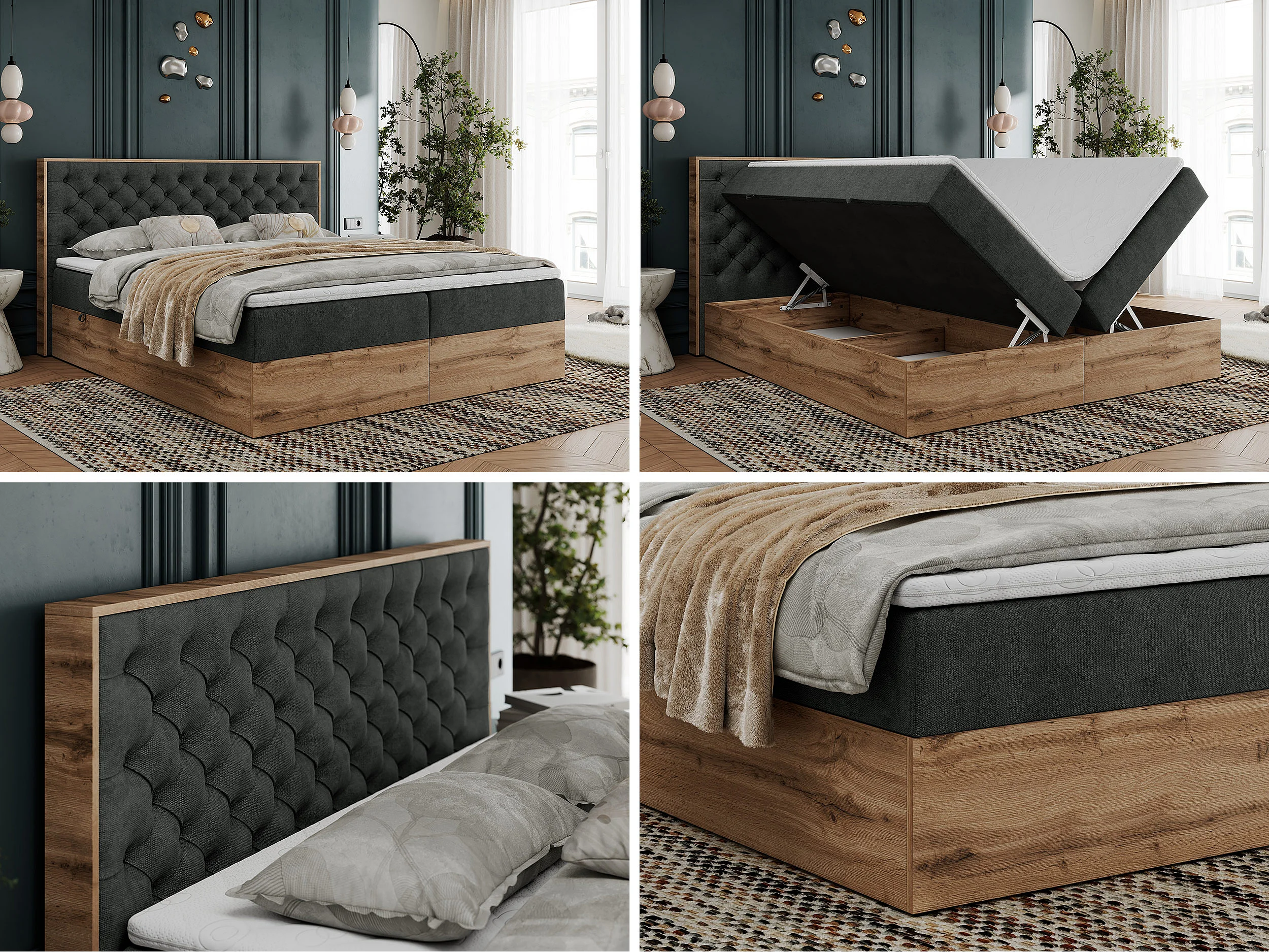 Boxspringbett ALBERO 3 - gesteppte Kopfstütze, Eiche Wotan Holzrahmen, Stauraum - 160x200 cm - H4 - Dunkelgrau Strukture