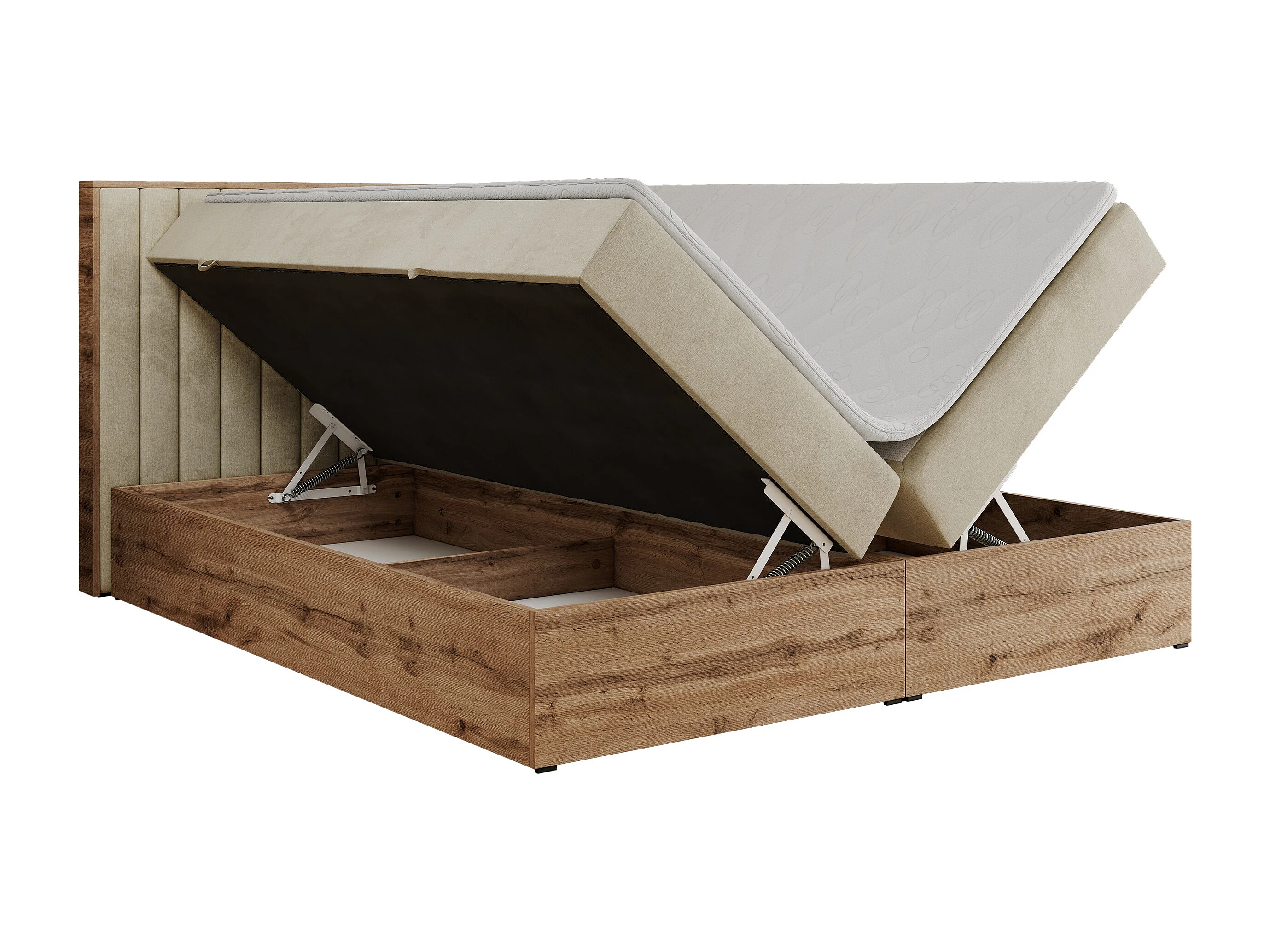 Boxspringbett ALBERO 4, Eiche Wotan Holzrahmen, mit Stauraum, genähtes Kopfteil - 140x200 cm - H3 - Beige Velvet