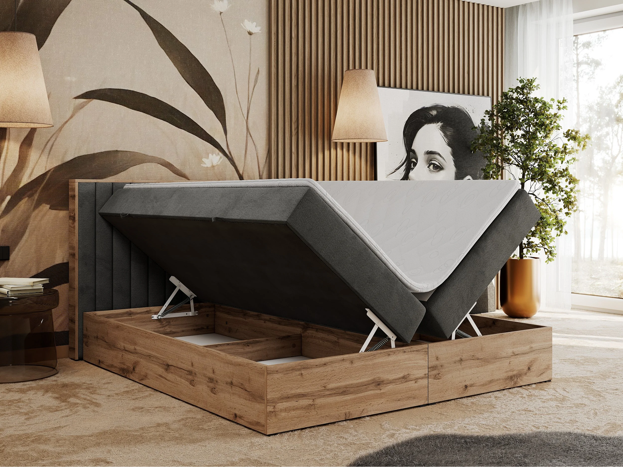 Boxspringbett ALBERO 4, Eiche Wotan Holzrahmen, mit Stauraum, genähtes Kopfteil - 140x200 cm - H3 - Dunkelgrau Velvet