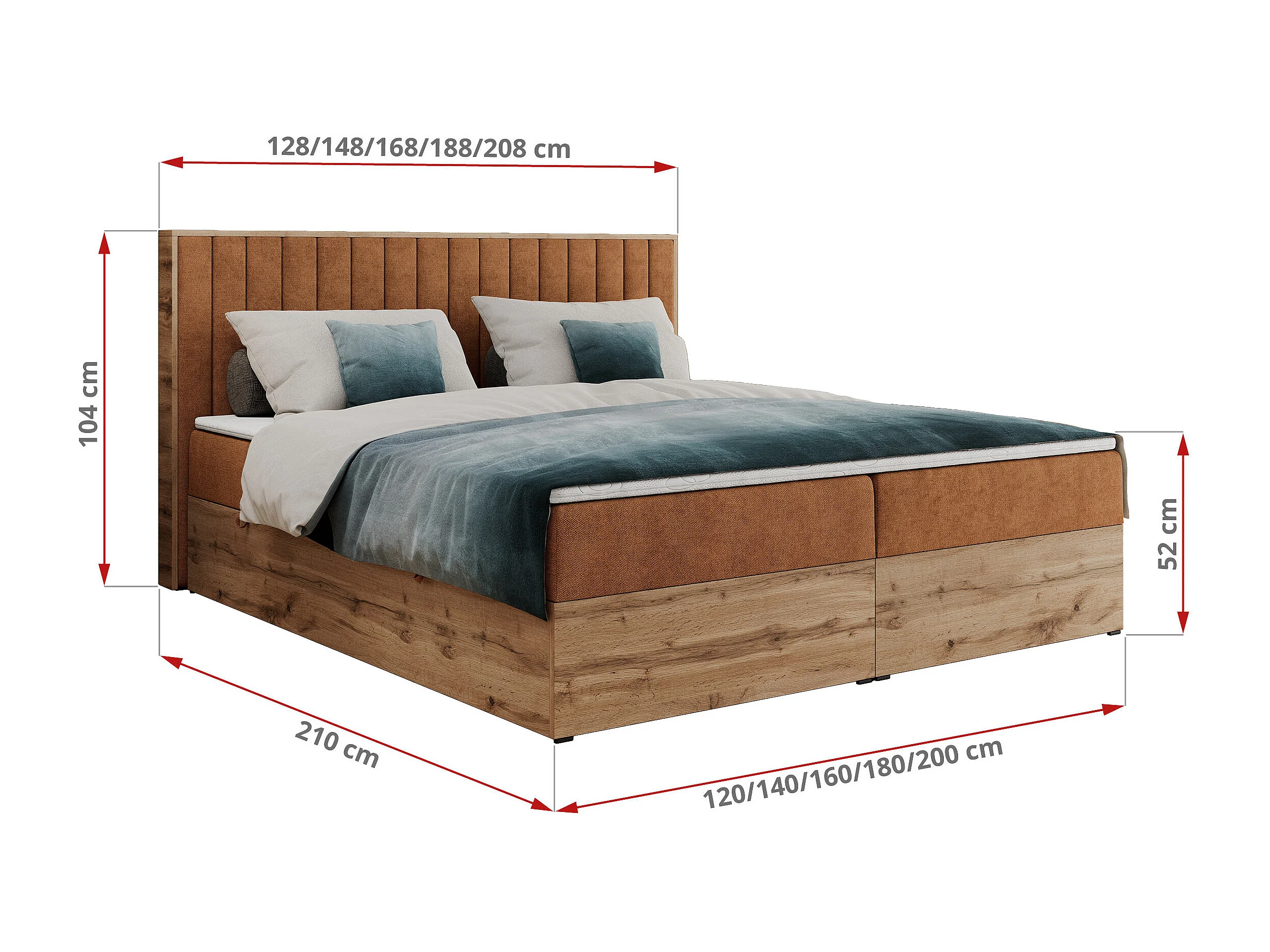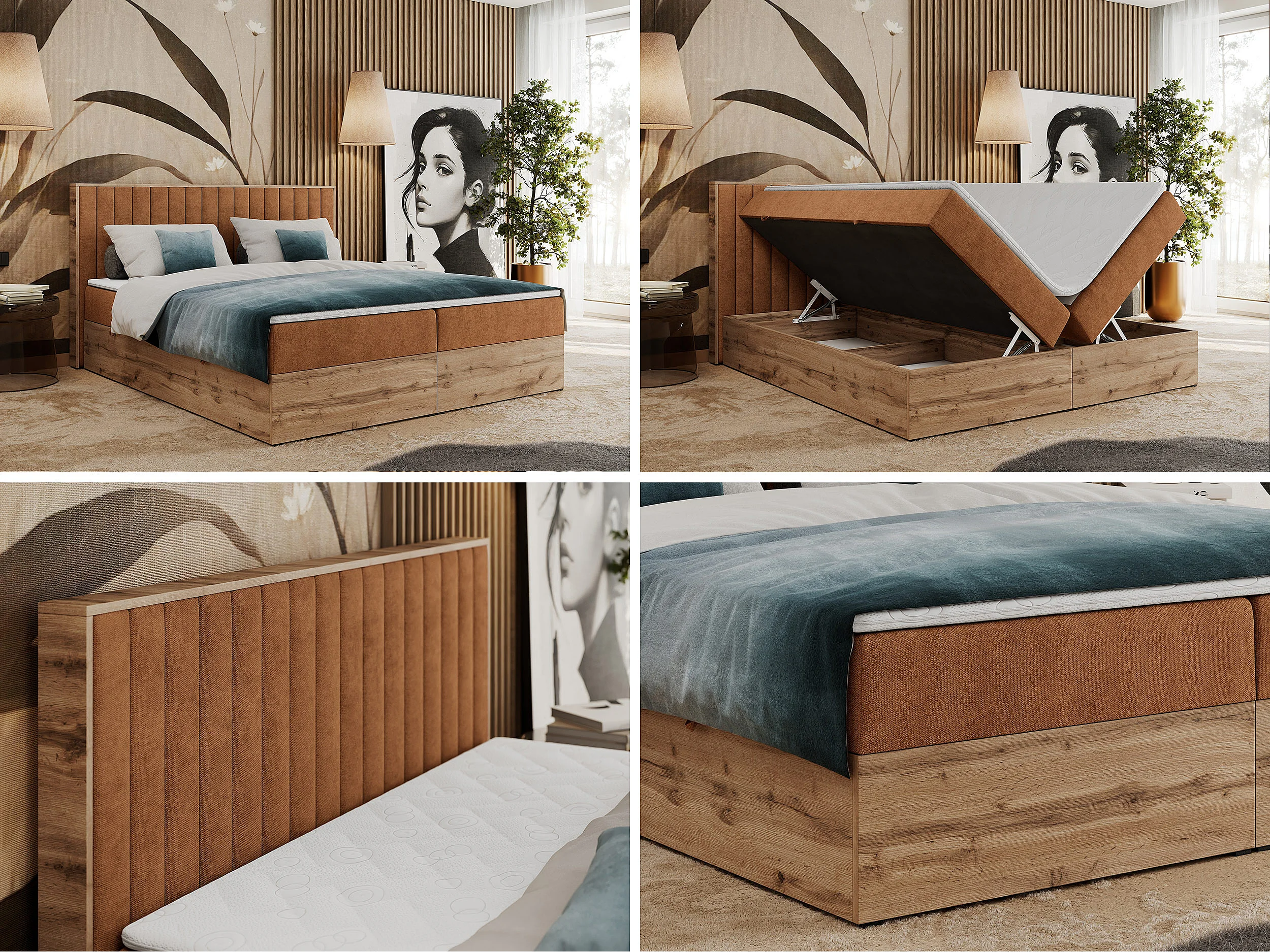 Boxspringbett ALBERO 4, Eiche Wotan Holzrahmen, mit Stauraum, genähtes Kopfteil - 140x200 cm - H3 - Orange Strukture