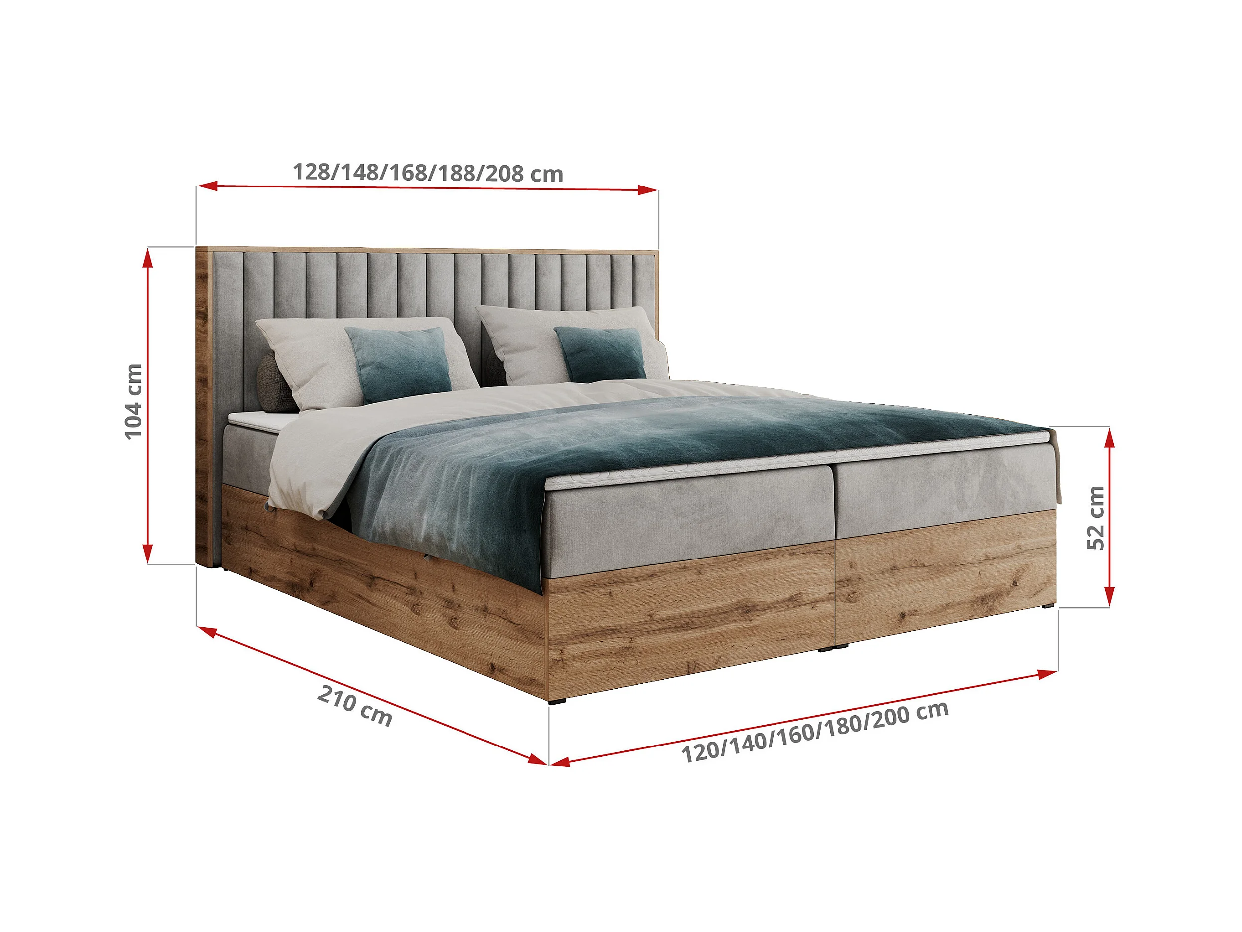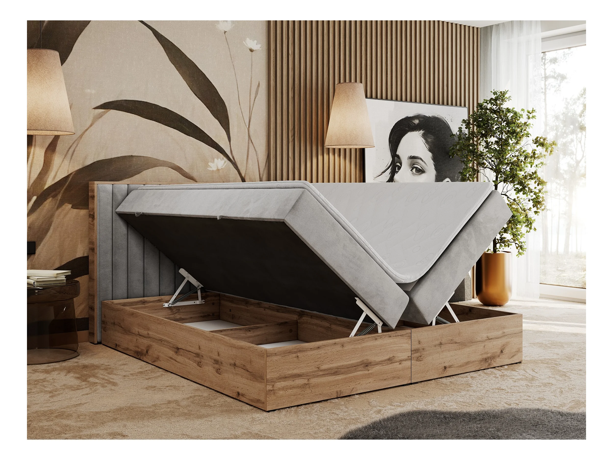 Boxspringbett ALBERO 4, Eiche Wotan Holzrahmen, mit Stauraum, genähtes Kopfteil - 140x200 cm - H4 - Hellgrau Velvet