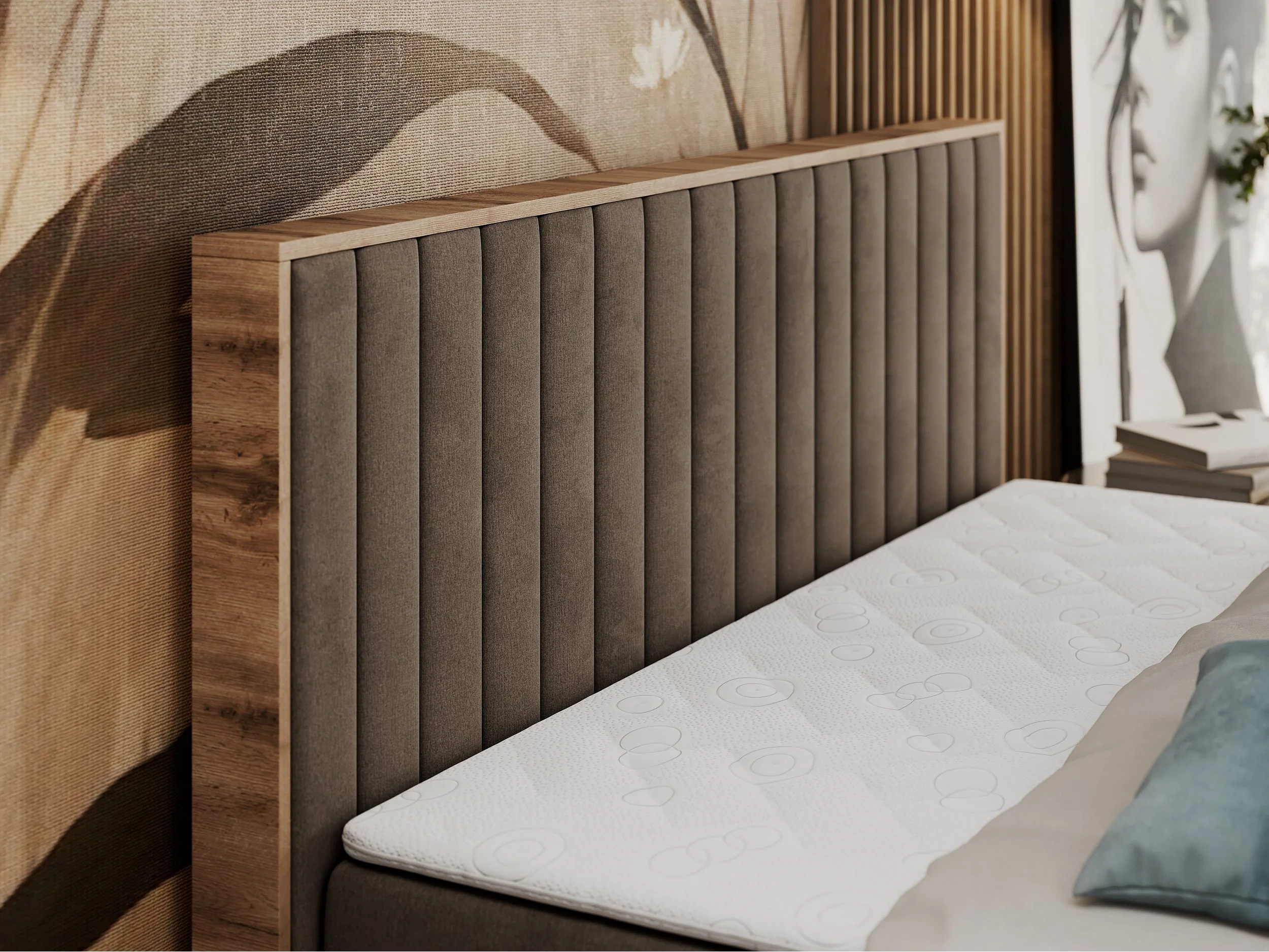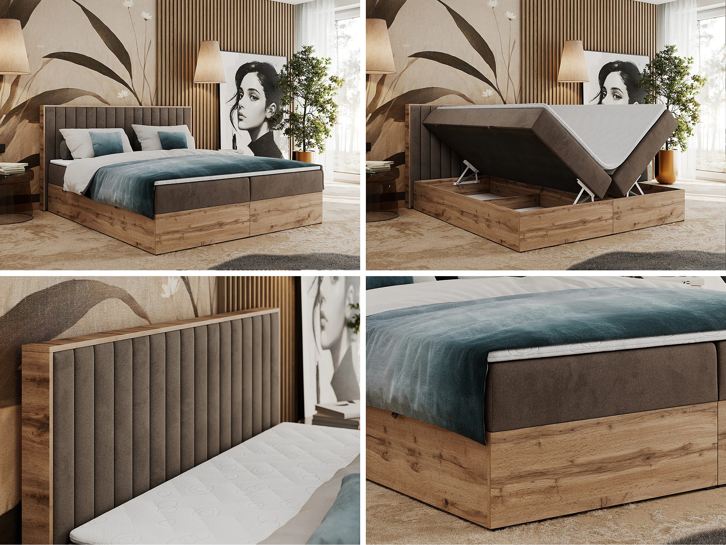 Boxspringbett ALBERO 4, Eiche Wotan Holzrahmen, mit Stauraum, genähtes Kopfteil - 180x200 cm - H3 - Braun Velvet
