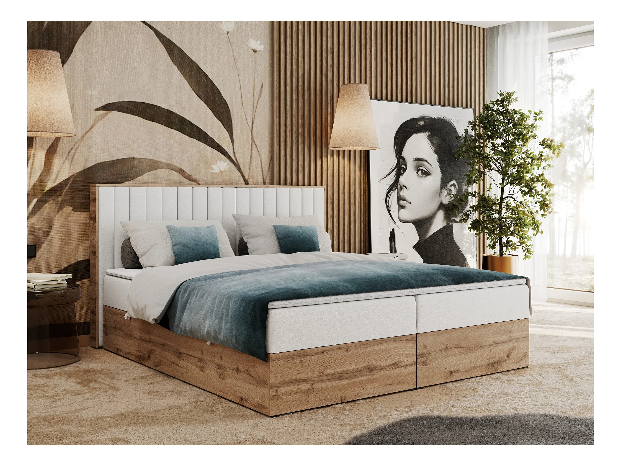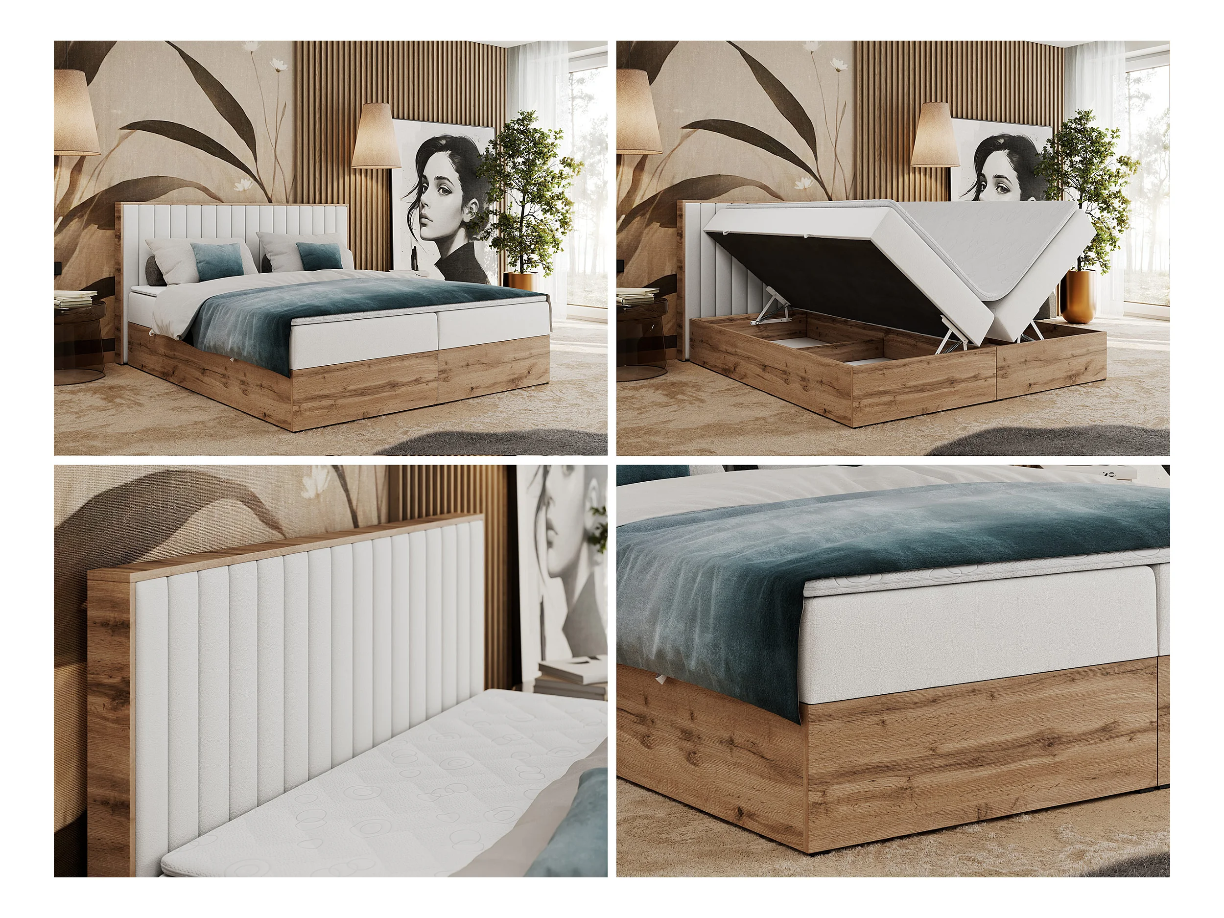 Boxspringbett ALBERO 4, Eiche Wotan Holzrahmen, mit Stauraum, genähtes Kopfteil - 180x200 cm - H4 - Weiß Kunstleder
