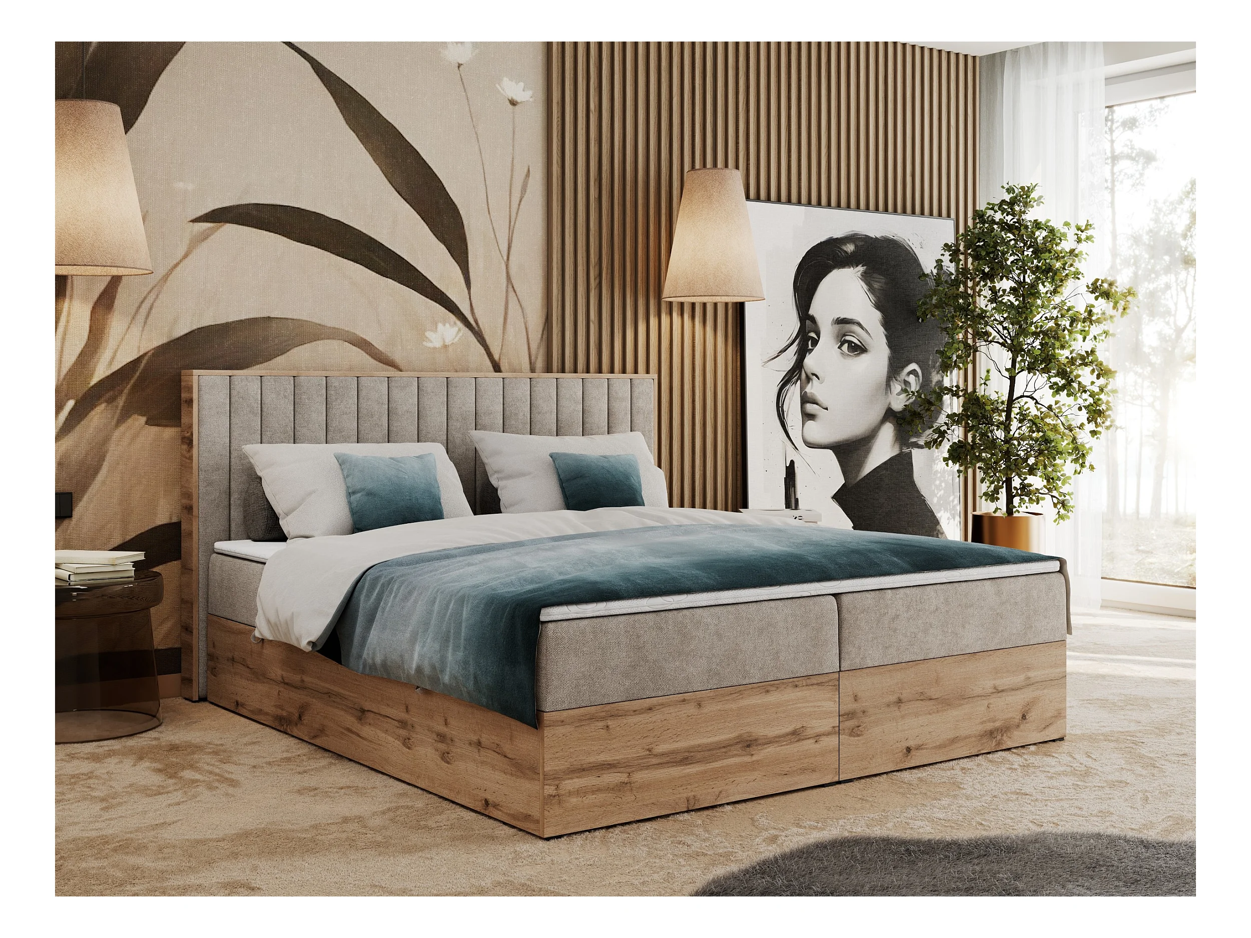 Boxspringbett ALBERO 4, Eiche Wotan Holzrahmen, mit Stauraum, genähtes Kopfteil - 200x200 cm - H4 - Beige Strukture
