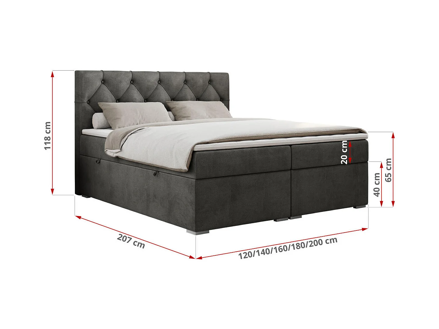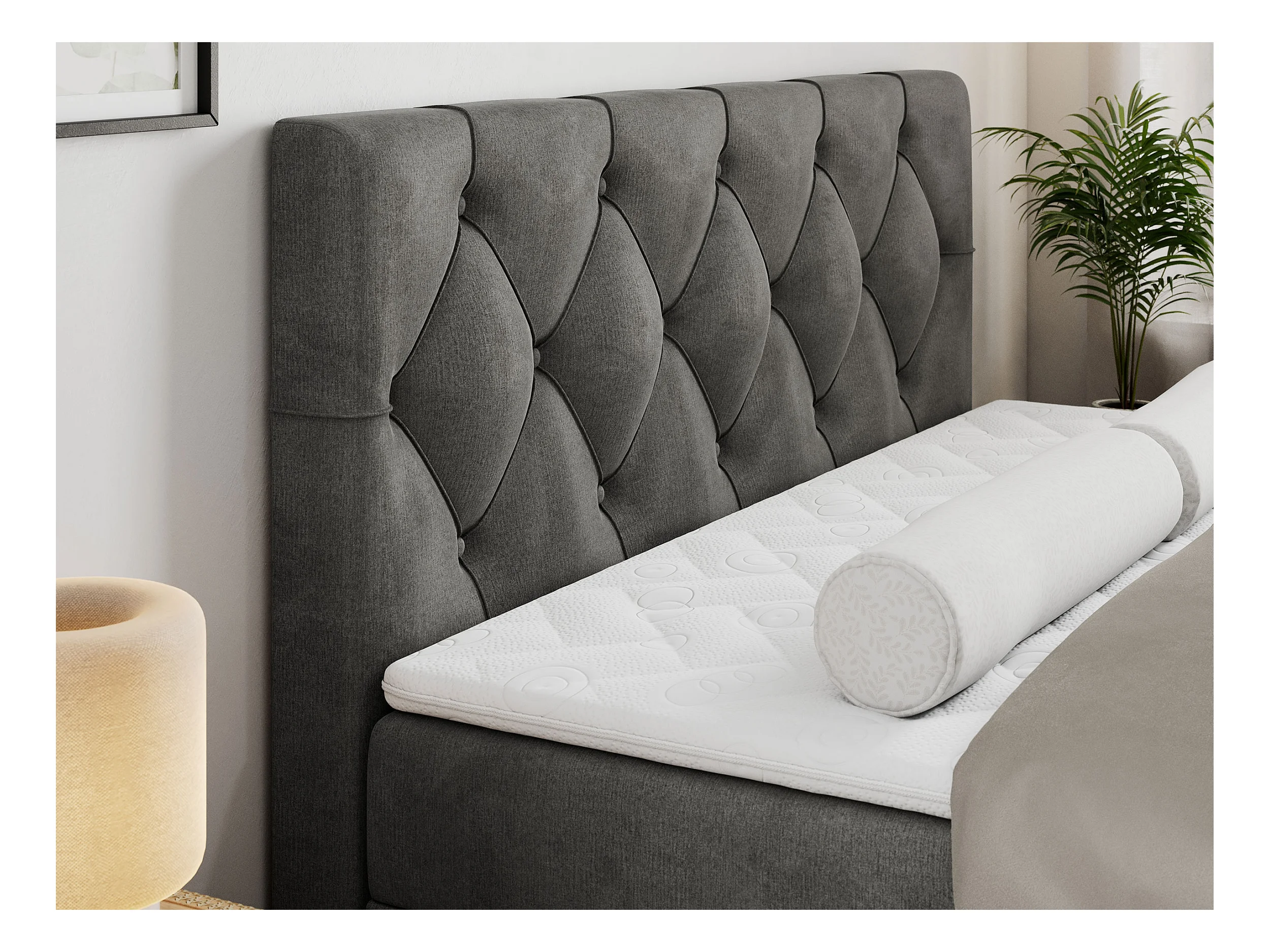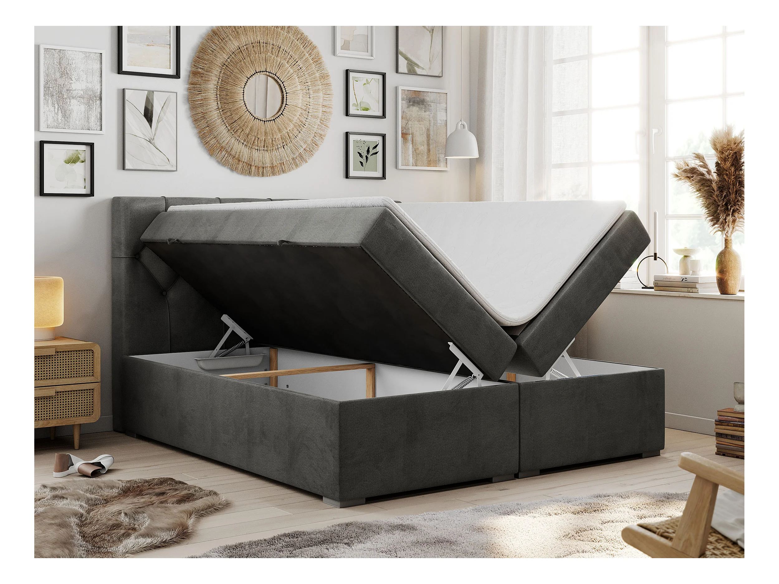 Boxspringbett ALDA - Doppelbett mit gestepptem Kopfteil, Multipocket-Matratze und Topper, zwei Bettkästen - 180x200 cm - H4 - Dunkelgrau Velvet