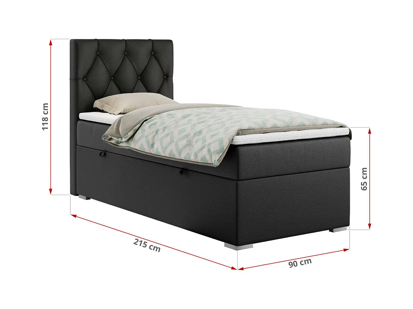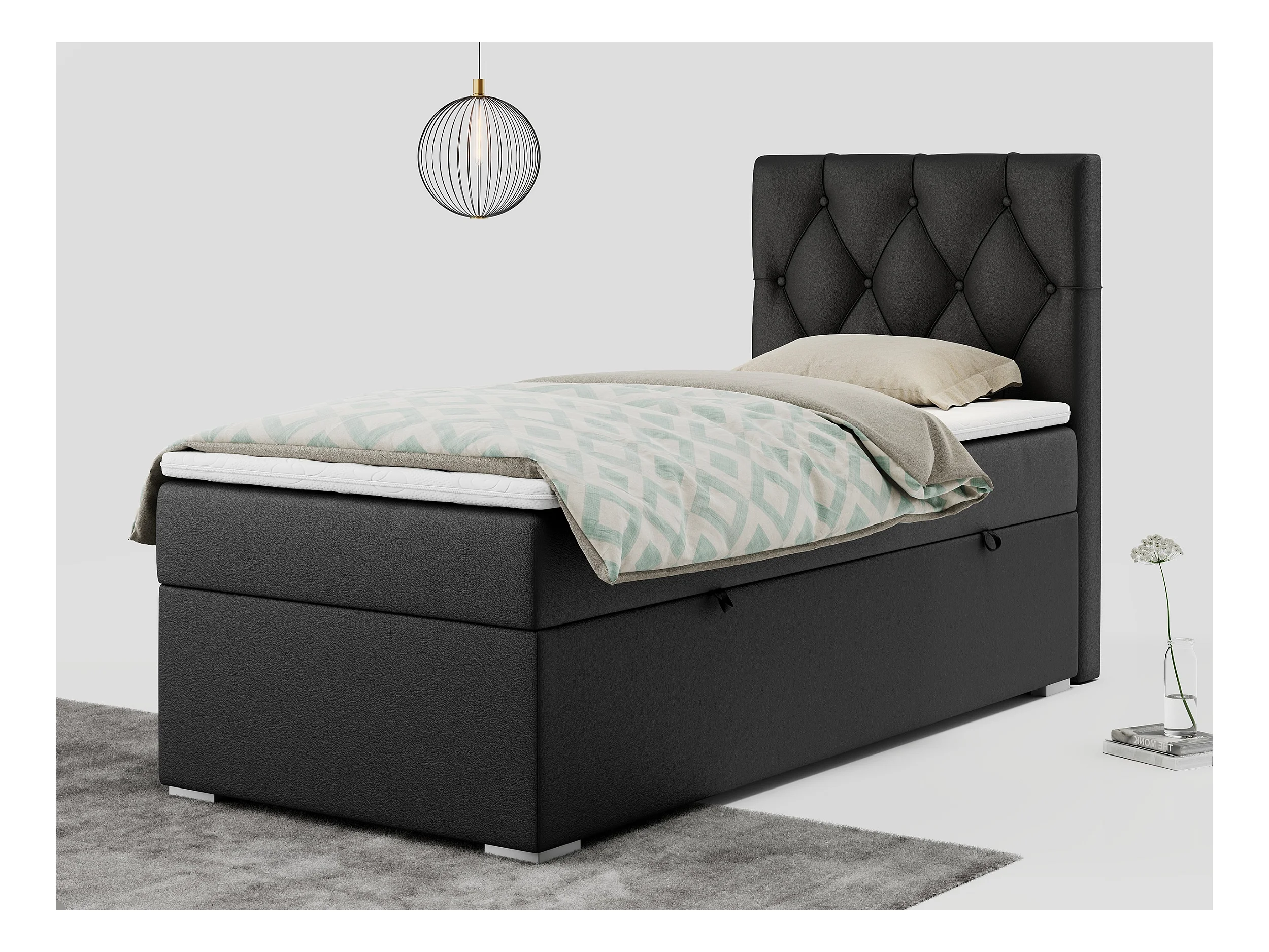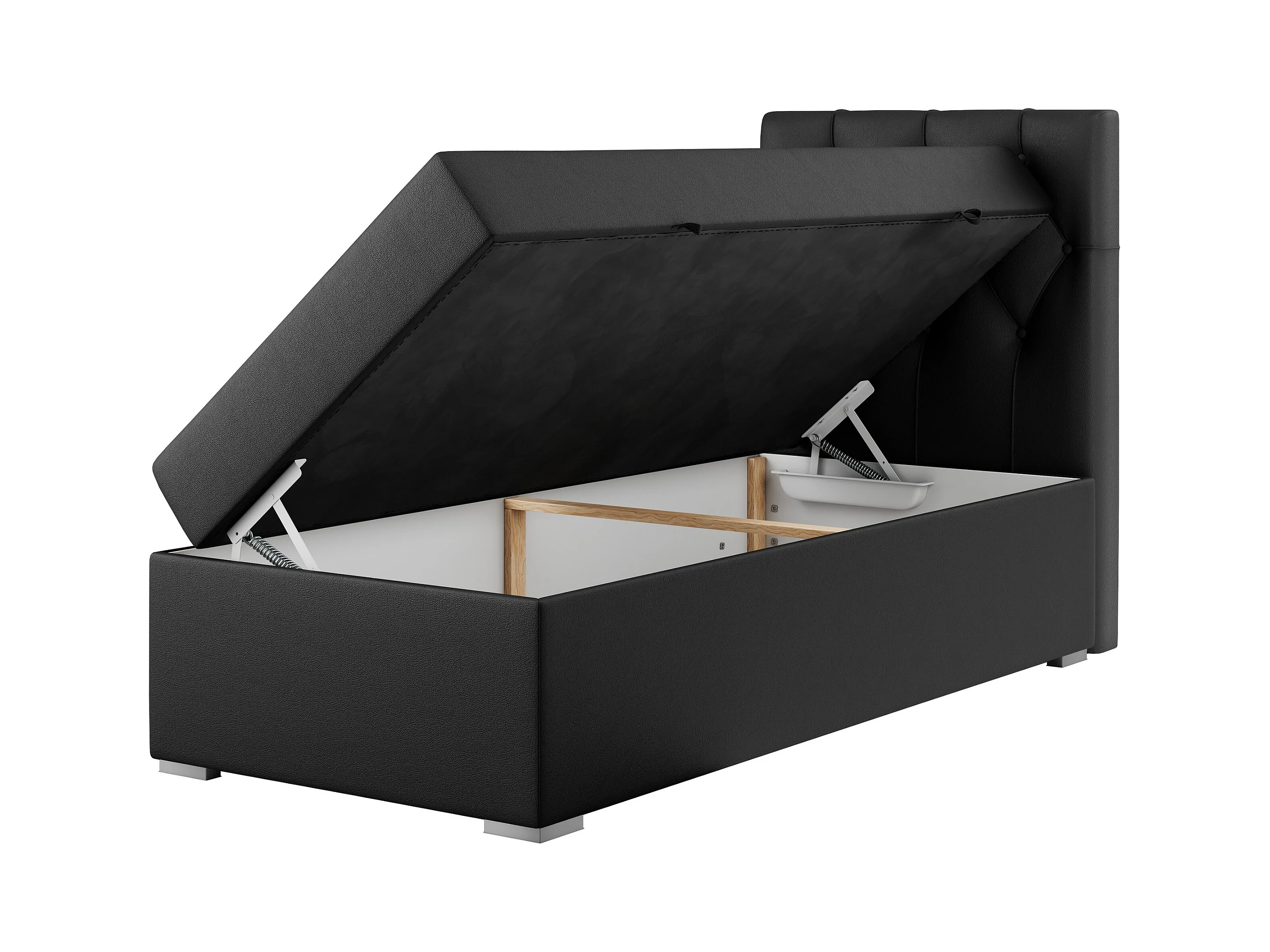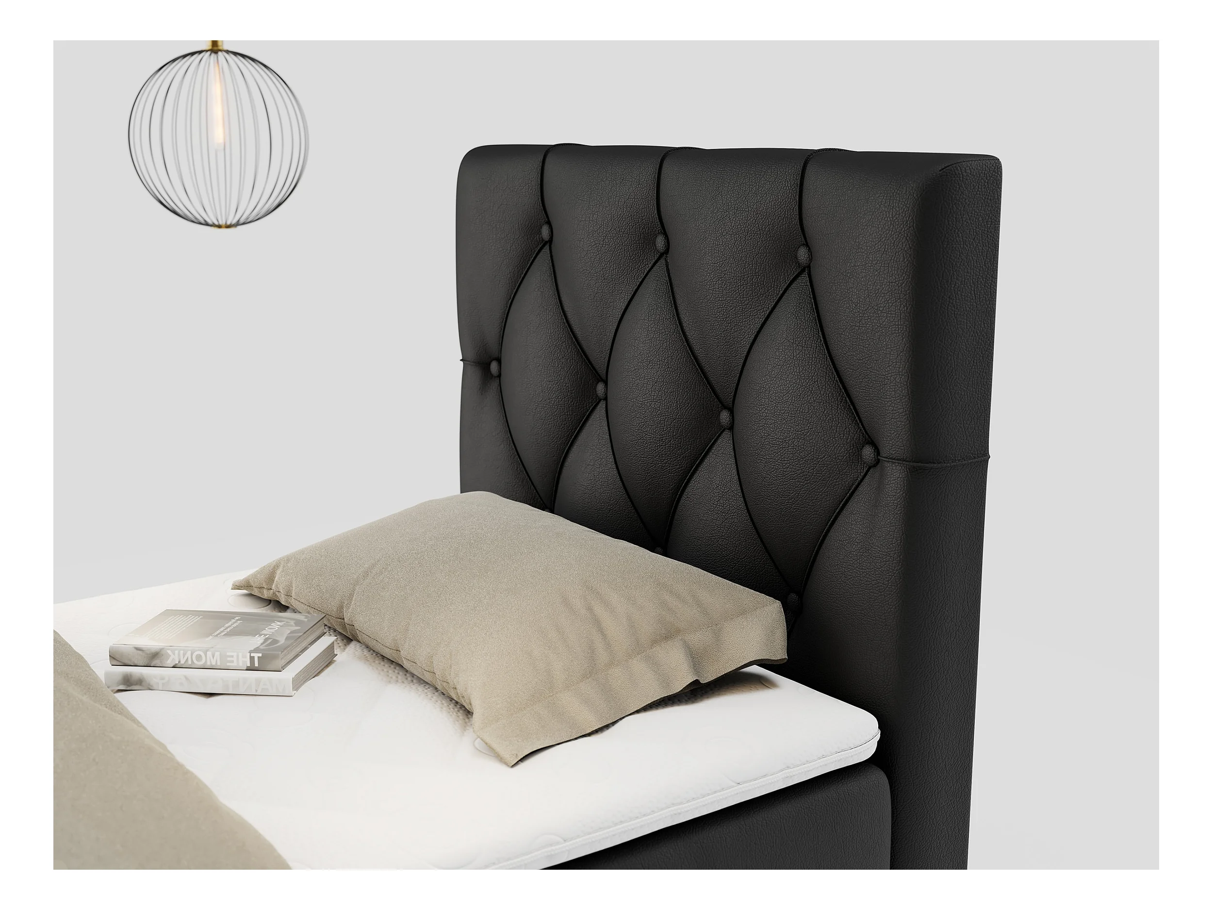Boxspringbett ALDA - Einzelbett mit gestepptem Kopfteil, Multipocket-Matratze und Topper, Bettkasten - 90x200 cm - H3 - Schwarz Kunstleder - Rechts Seite