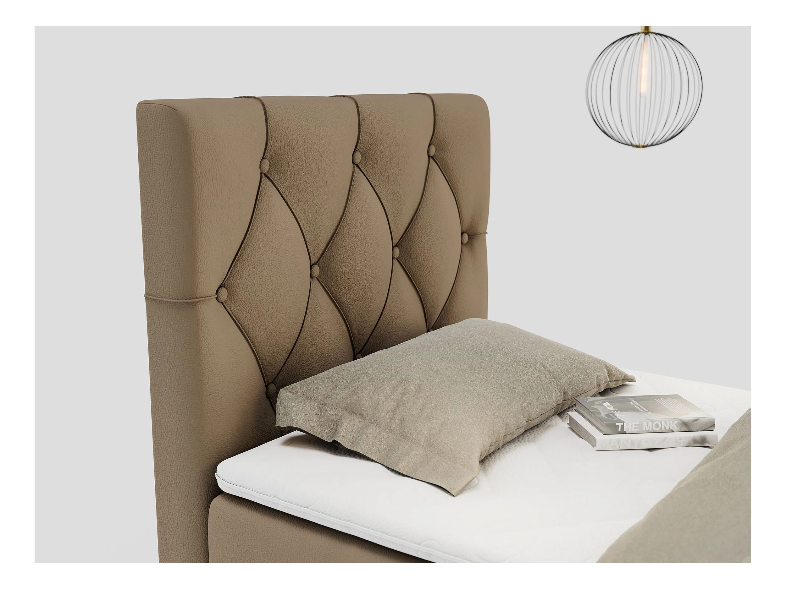 Boxspringbett ALDA - Einzelbett mit gestepptem Kopfteil, Multipocket-Matratze und Topper, Bettkasten - 90x200 cm - H4 - Braun Kunstleder - Links Seite