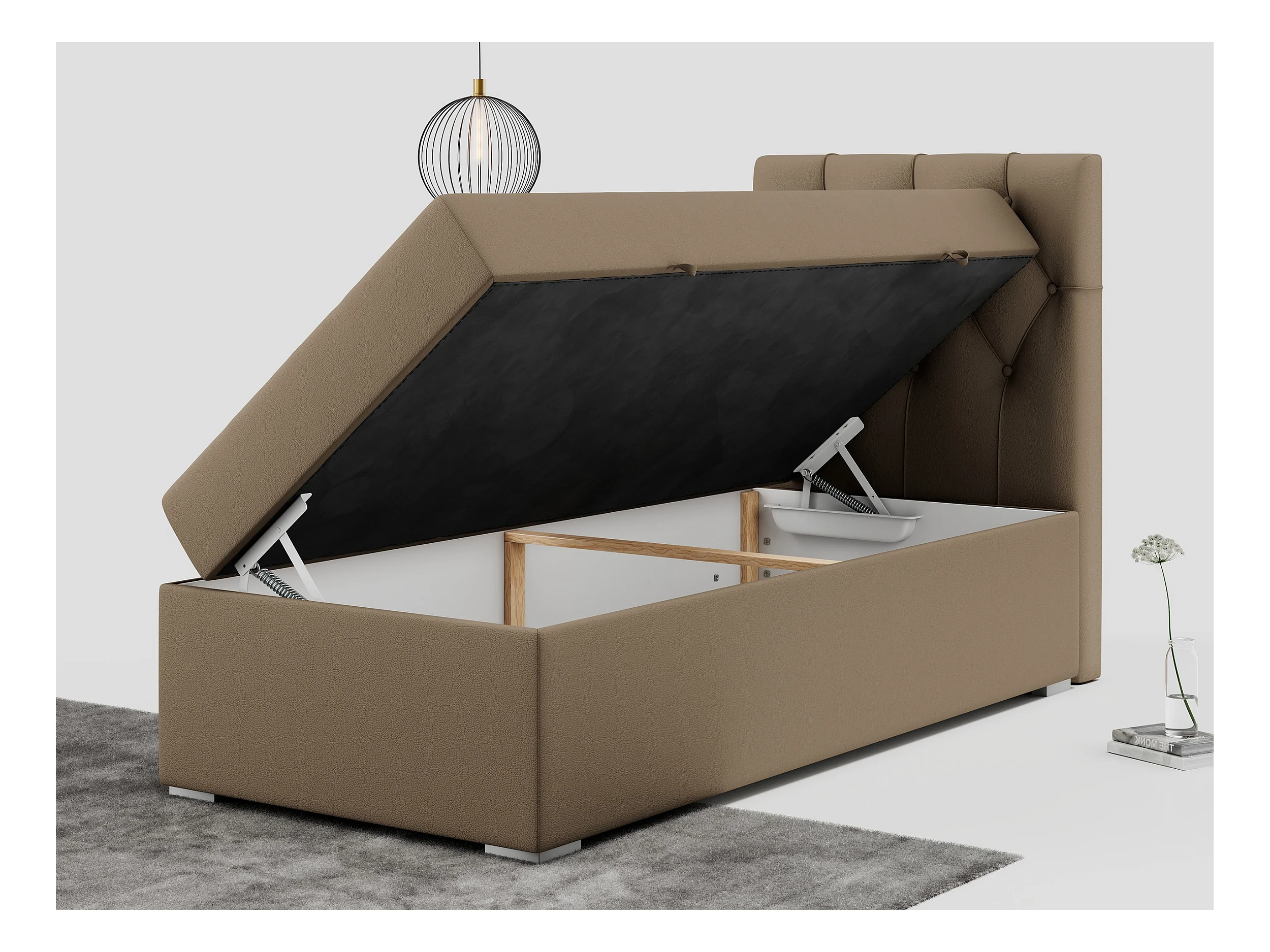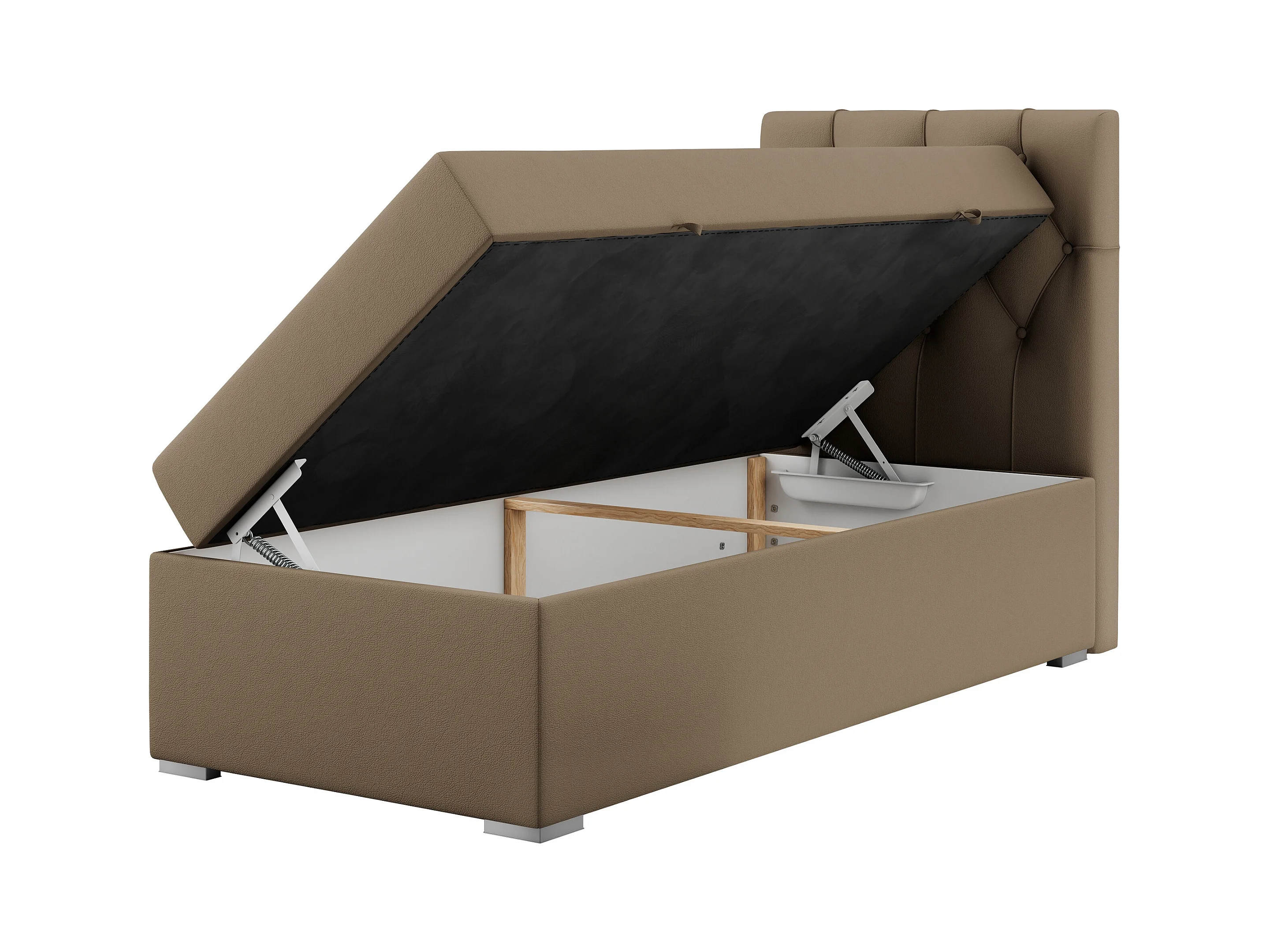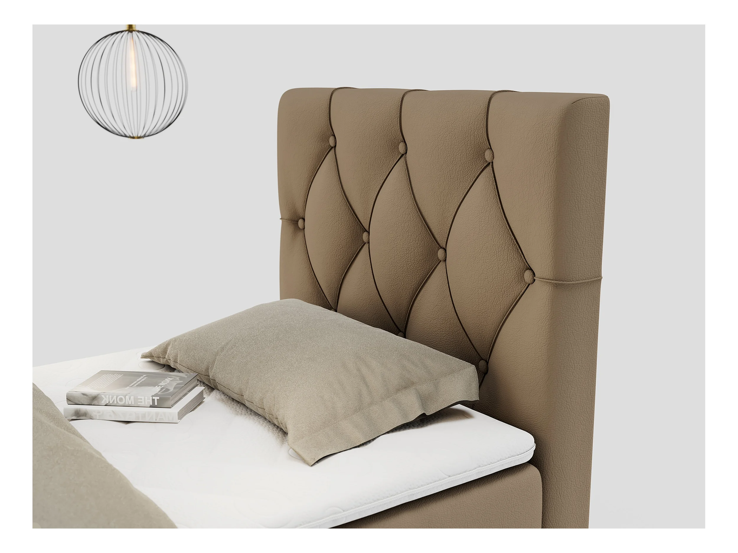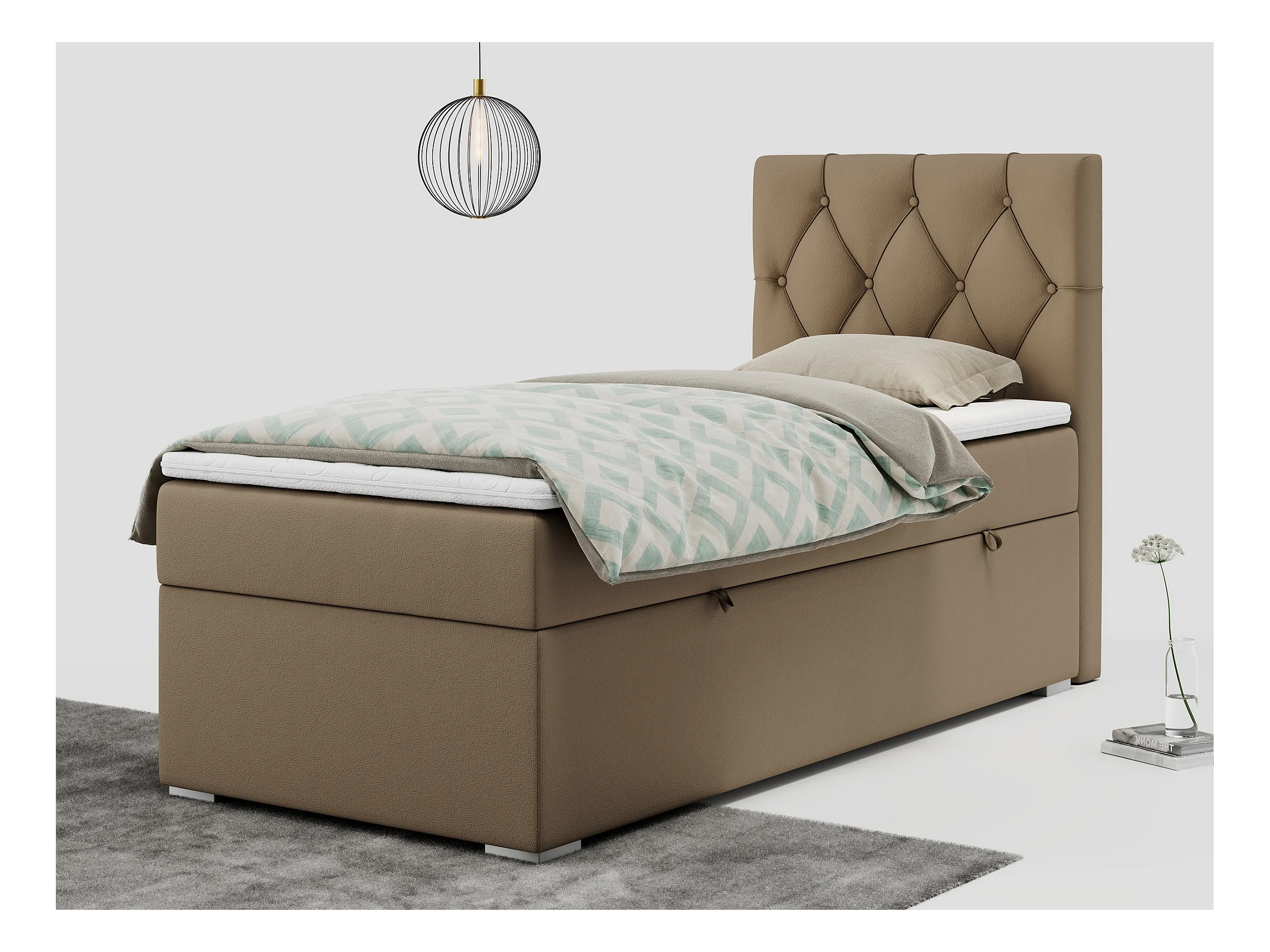 Boxspringbett ALDA - Einzelbett mit gestepptem Kopfteil, Multipocket-Matratze und Topper, Bettkasten - 90x200 cm - H4 - Braun Kunstleder - Rechts Seite