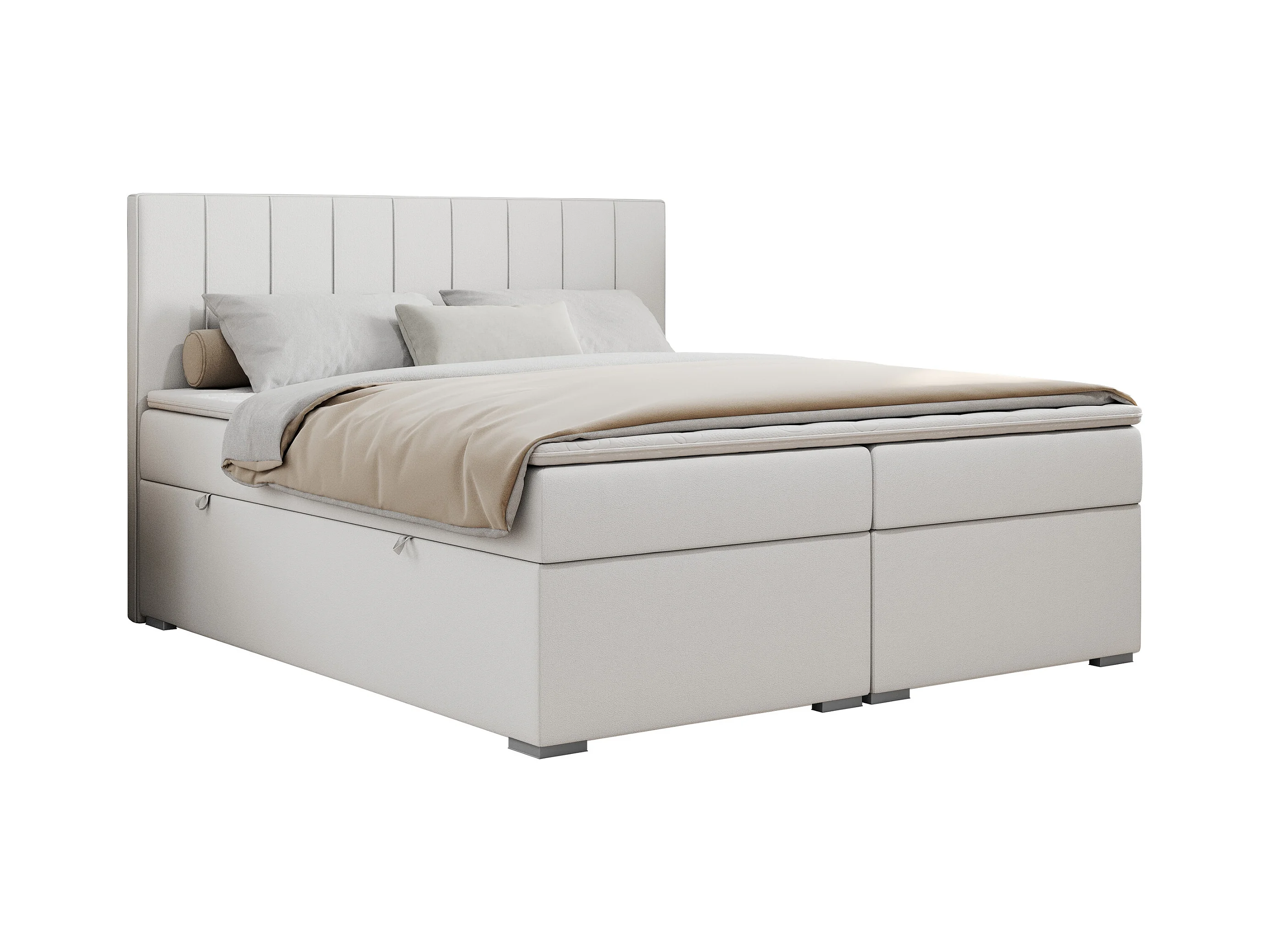 Boxspringbett ALLY - gestreiftes, genähtes Kopfteil, zwei Bettkästen, Multipocket-Matratzen, Praktisch Polsterbett - 140x200 cm - H3 - Weiß Kunstleder
