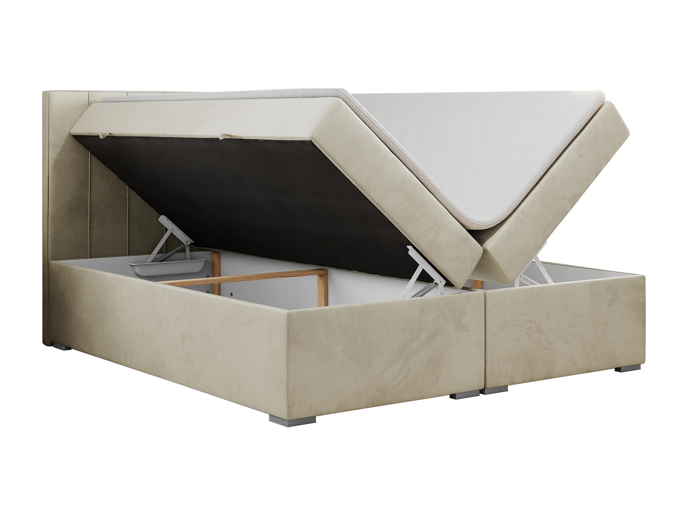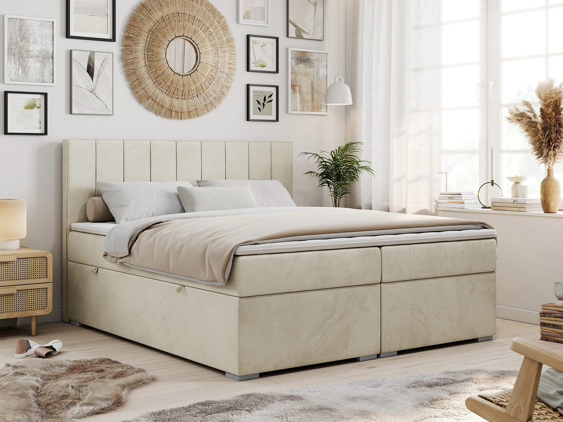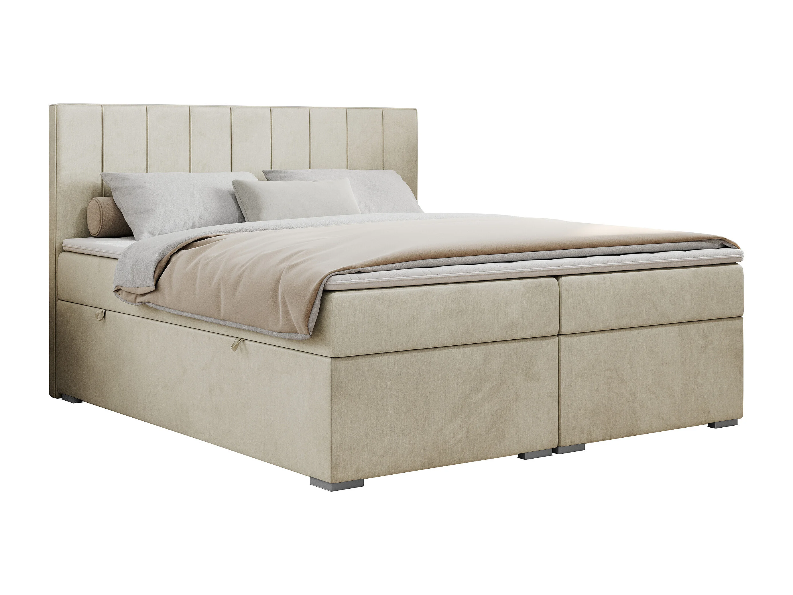 Boxspringbett ALLY - gestreiftes, genähtes Kopfteil, zwei Bettkästen, Multipocket-Matratzen, Praktisch Polsterbett - 180x200 cm - H3 - Beige Velvet