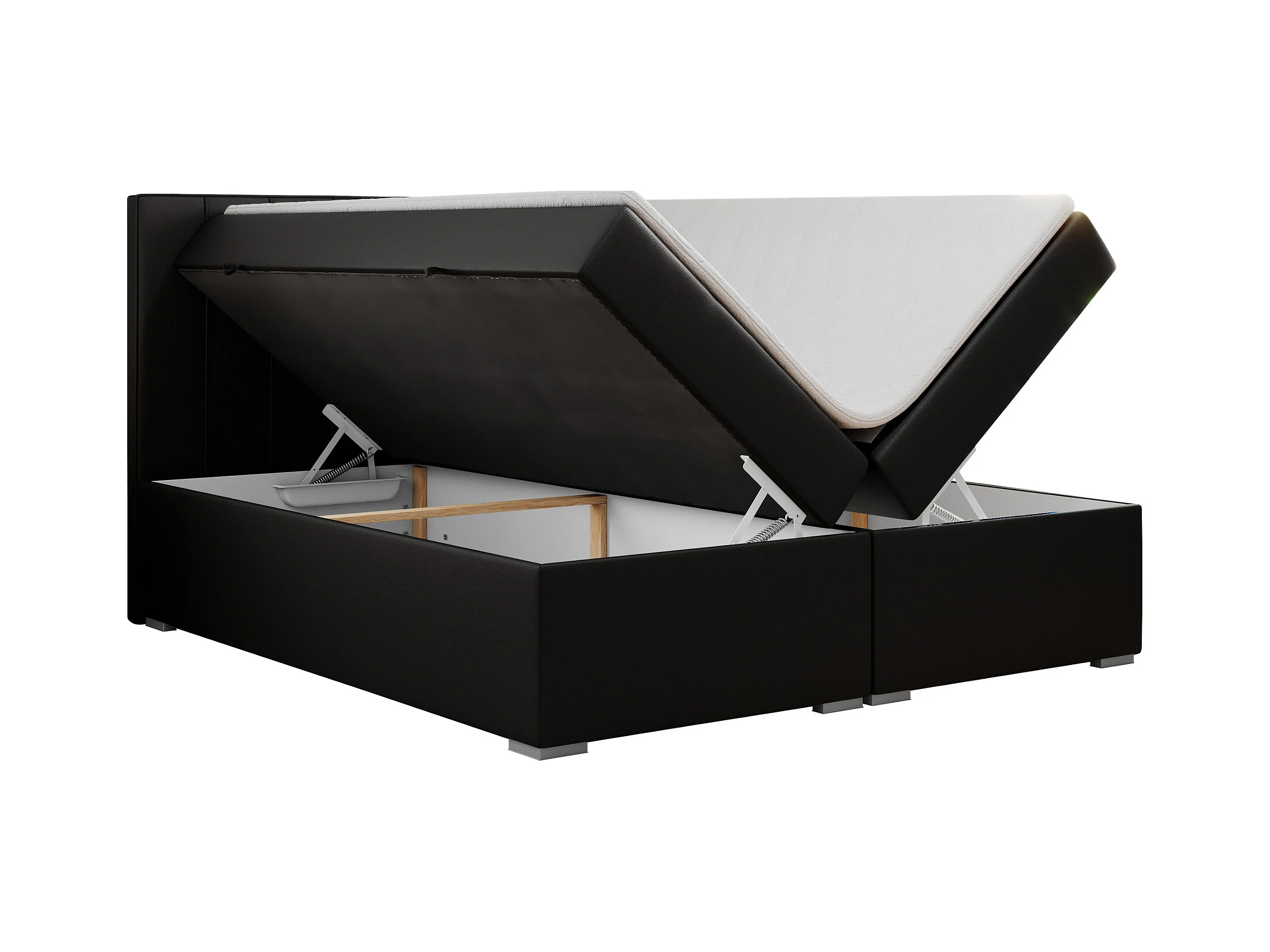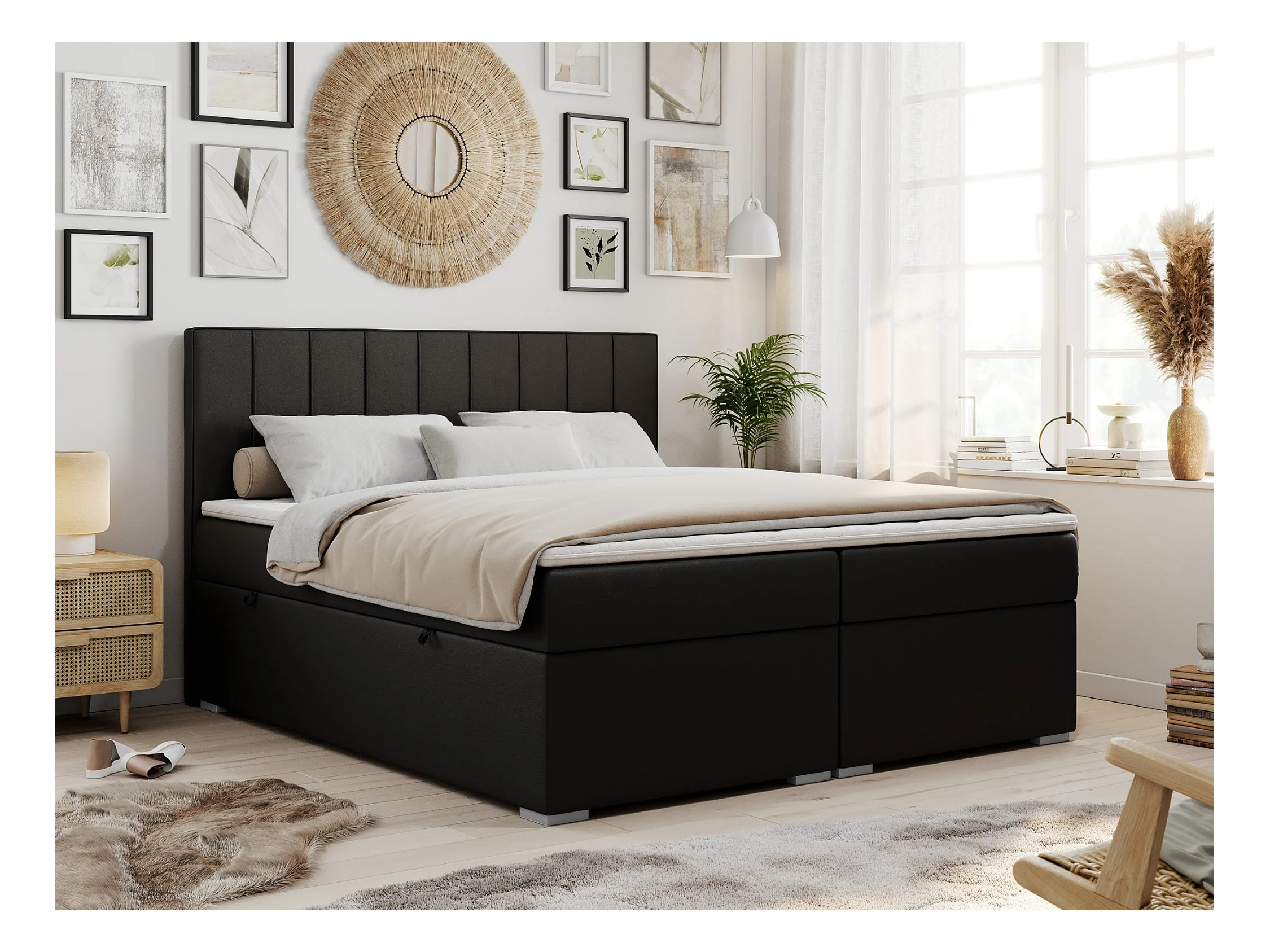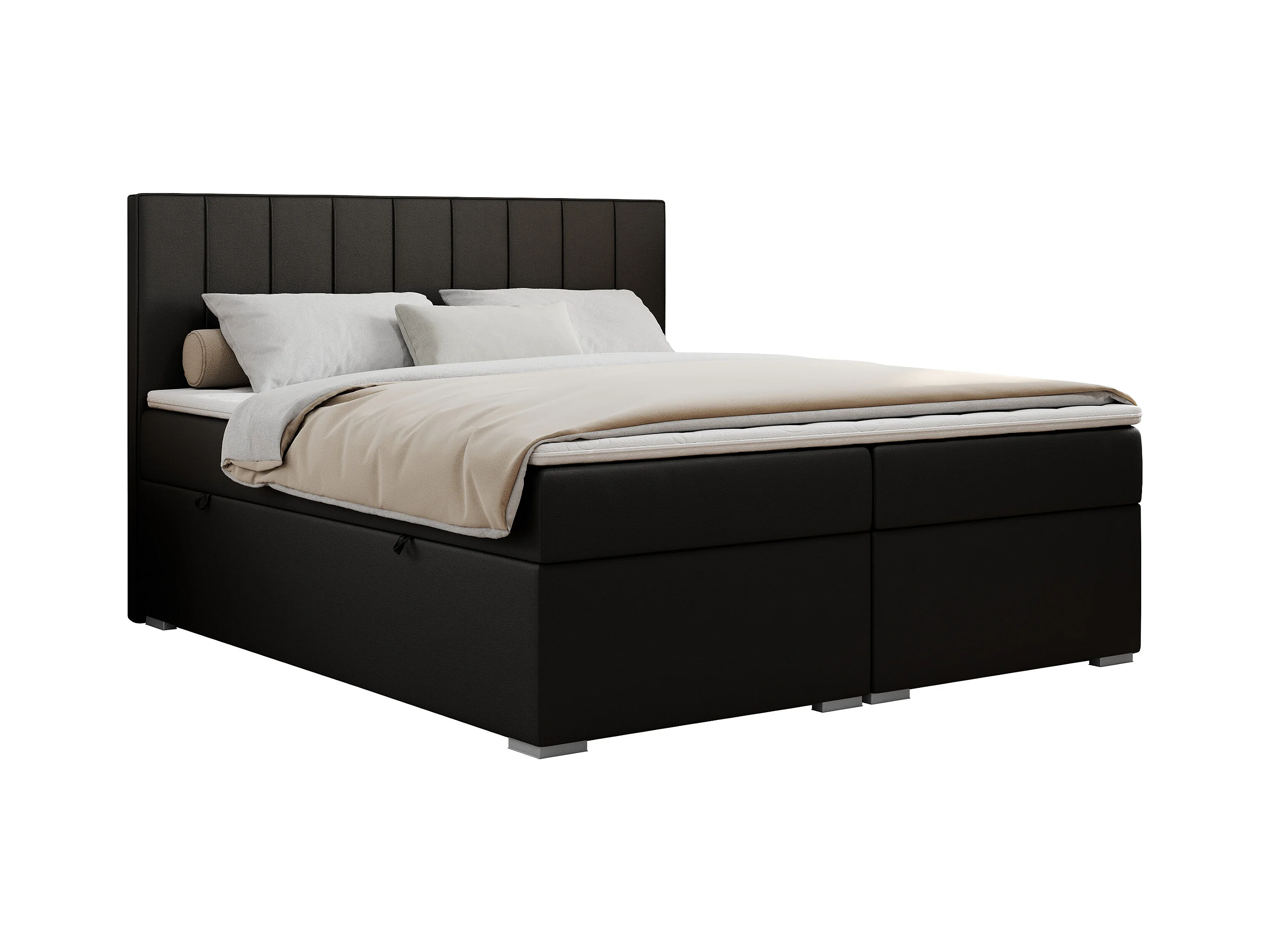 Boxspringbett ALLY - gestreiftes, genähtes Kopfteil, zwei Bettkästen, Multipocket-Matratzen, Praktisch Polsterbett - 180x200 cm - H3 - Schwarz Kunstleder