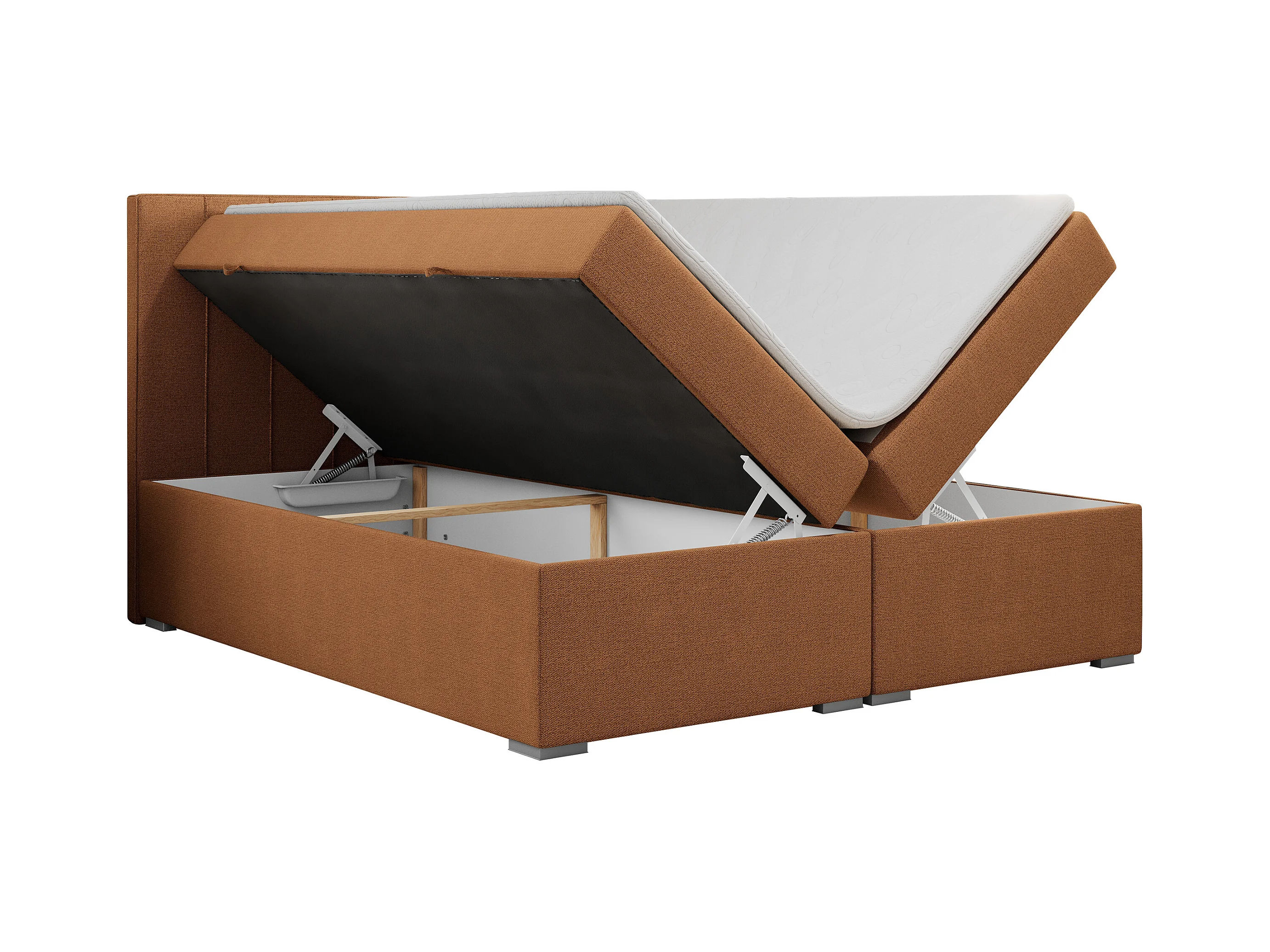 Boxspringbett ALLY - gestreiftes, genähtes Kopfteil, zwei Bettkästen, Multipocket-Matratzen, Praktisch Polsterbett - 200x200 cm - H3 - Orange Strukture