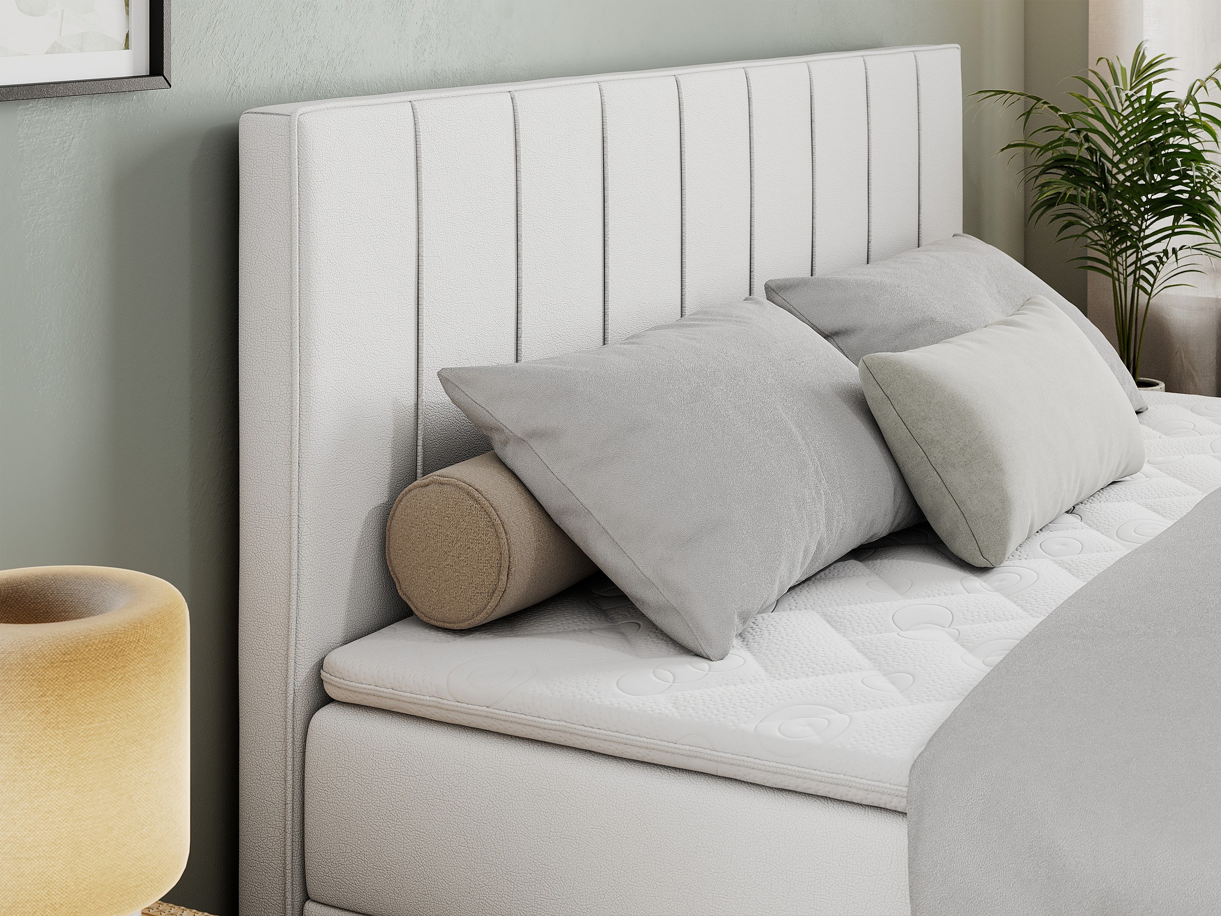 Boxspringbett ALLY - gestreiftes, genähtes Kopfteil, zwei Bettkästen, Multipocket-Matratzen, Praktisch Polsterbett - 200x200 cm - H4 - Weiß Kunstleder