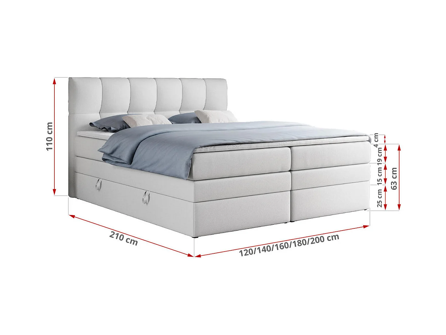 Boxspringbett ALVIN KING, mit zwei Multipocket-Matratzen, Bettkästen, genähtes Kopfteil - 140x200 cm - H4 - Weiß Kunstleder