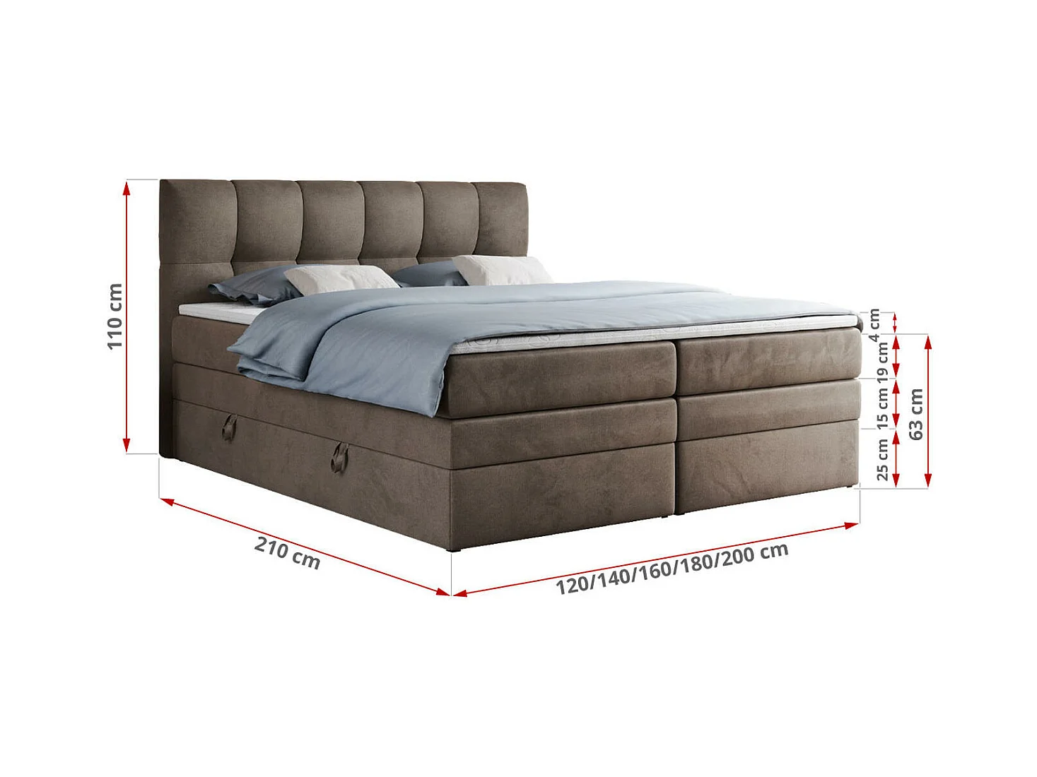 Boxspringbett ALVIN KING, mit zwei Multipocket-Matratzen, Bettkästen, genähtes Kopfteil - 160x200 cm - H4 - Braun Velvet