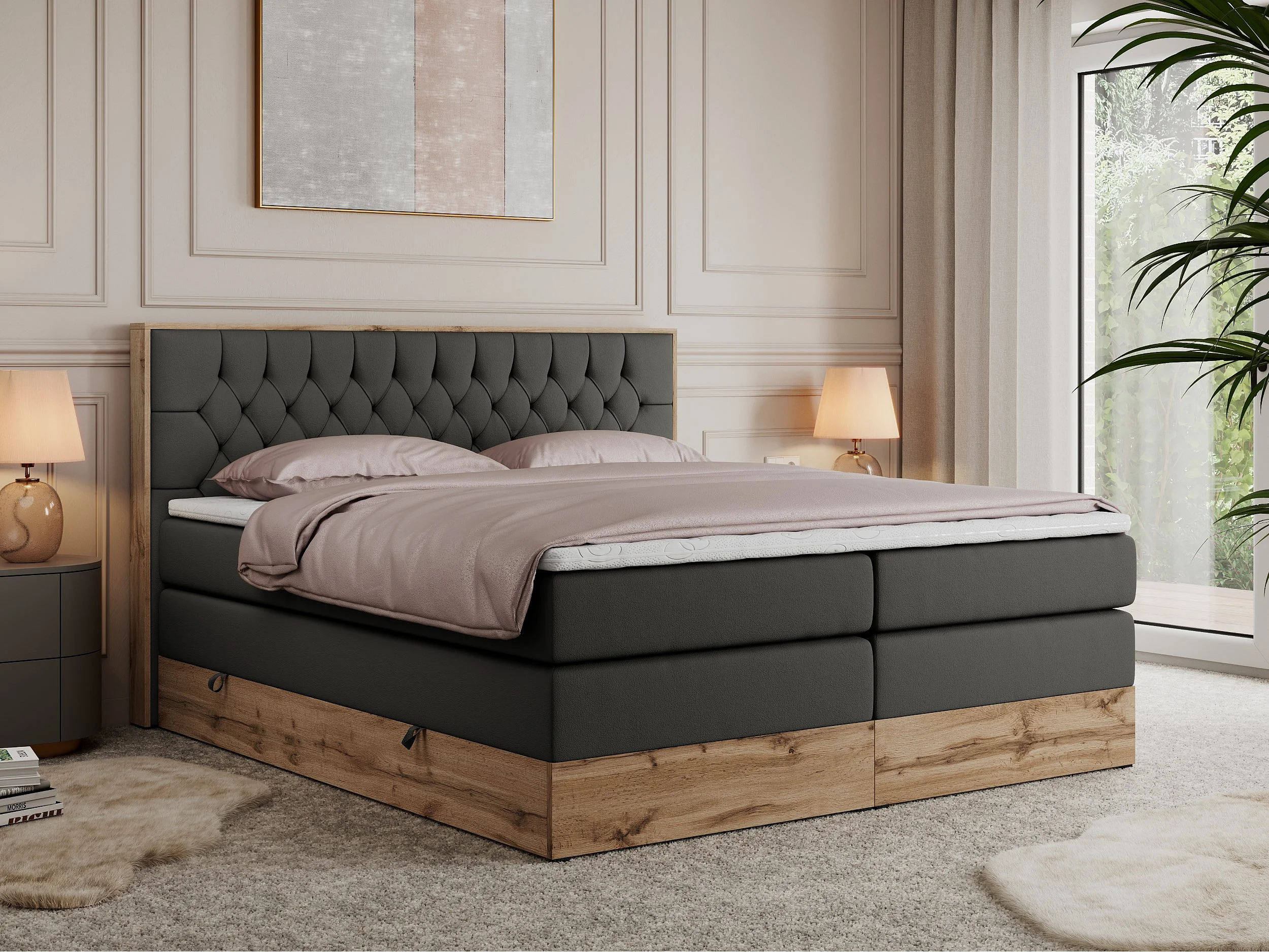Boxspringbett AMORE KING - gesteppte Kopfstütze, Polsterbett mit zwei Multipocket-Matratzen, Holzrahmen - 160x200 cm - H3 - Dunkelgrau Kunstleder