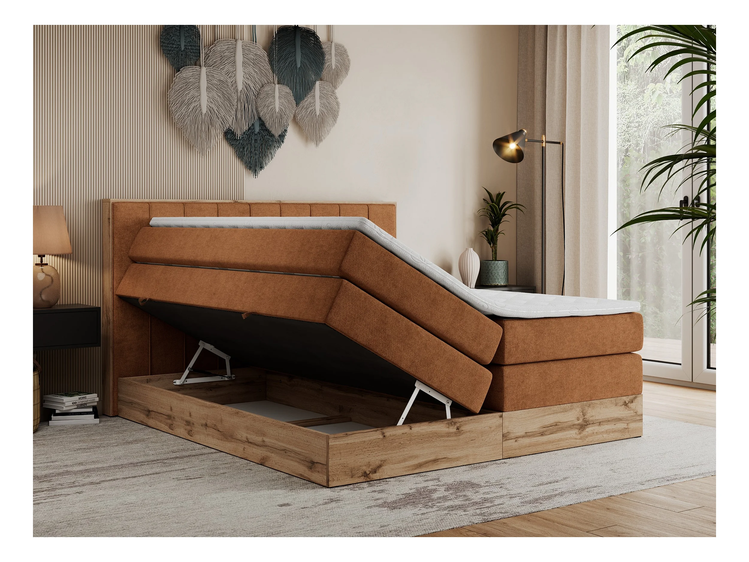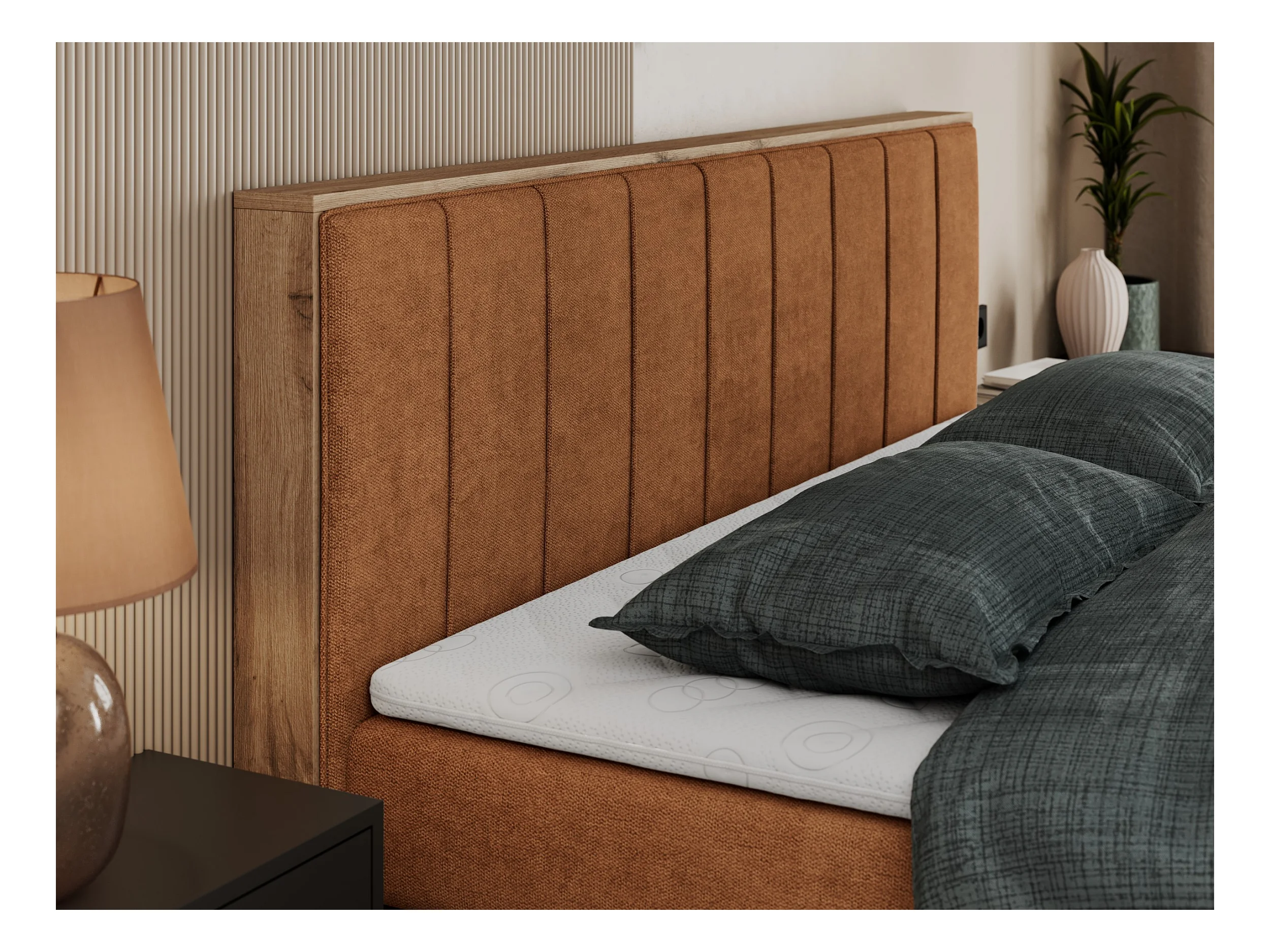 Boxspringbett BELLISSIMO KING - für Schlafzimmer, zwei Multipocket-Matratzen, Set mit Kopfteil und Topper, Holzrahmen - 160x200 cm - H4 - Orange Strukture