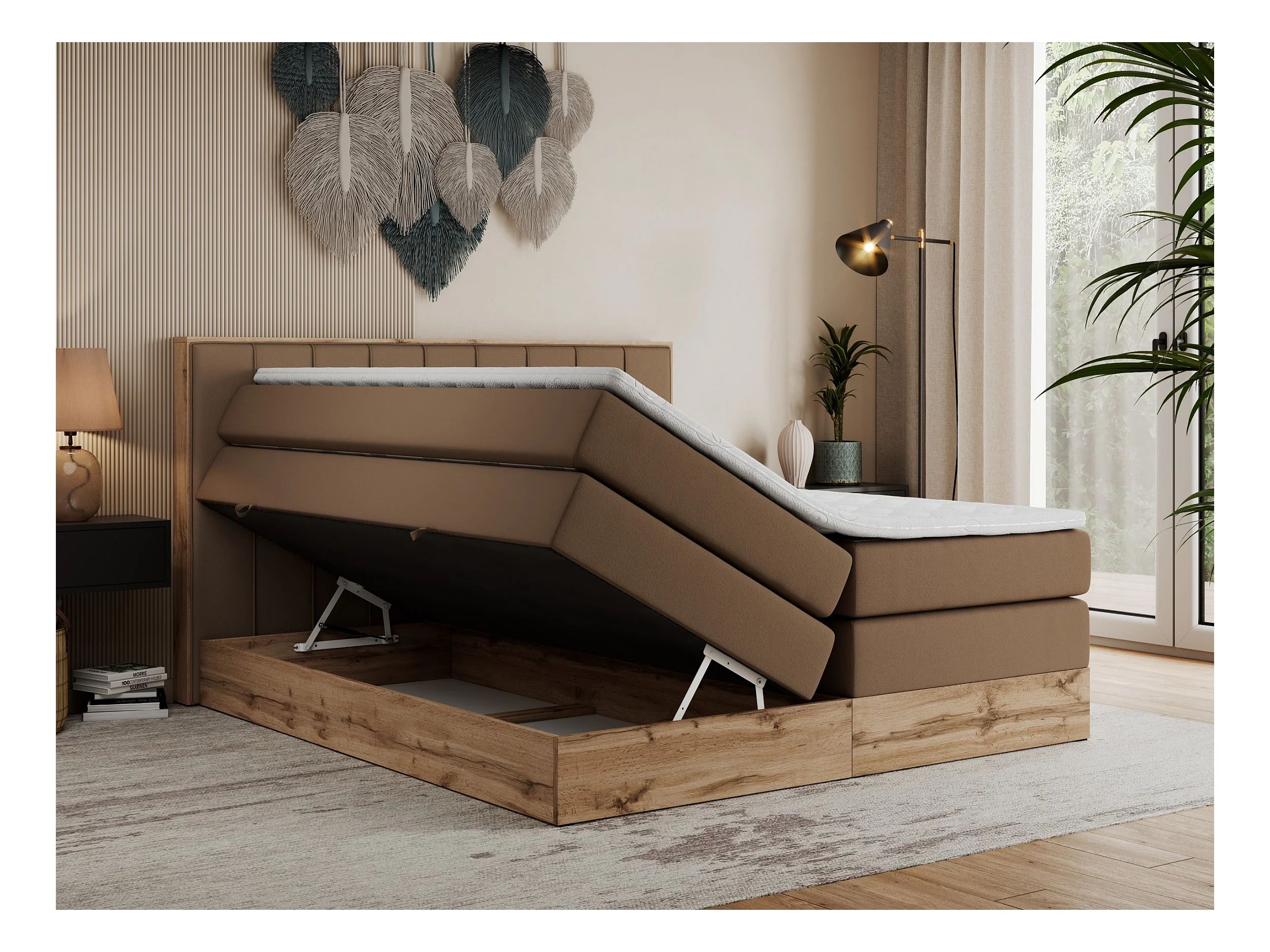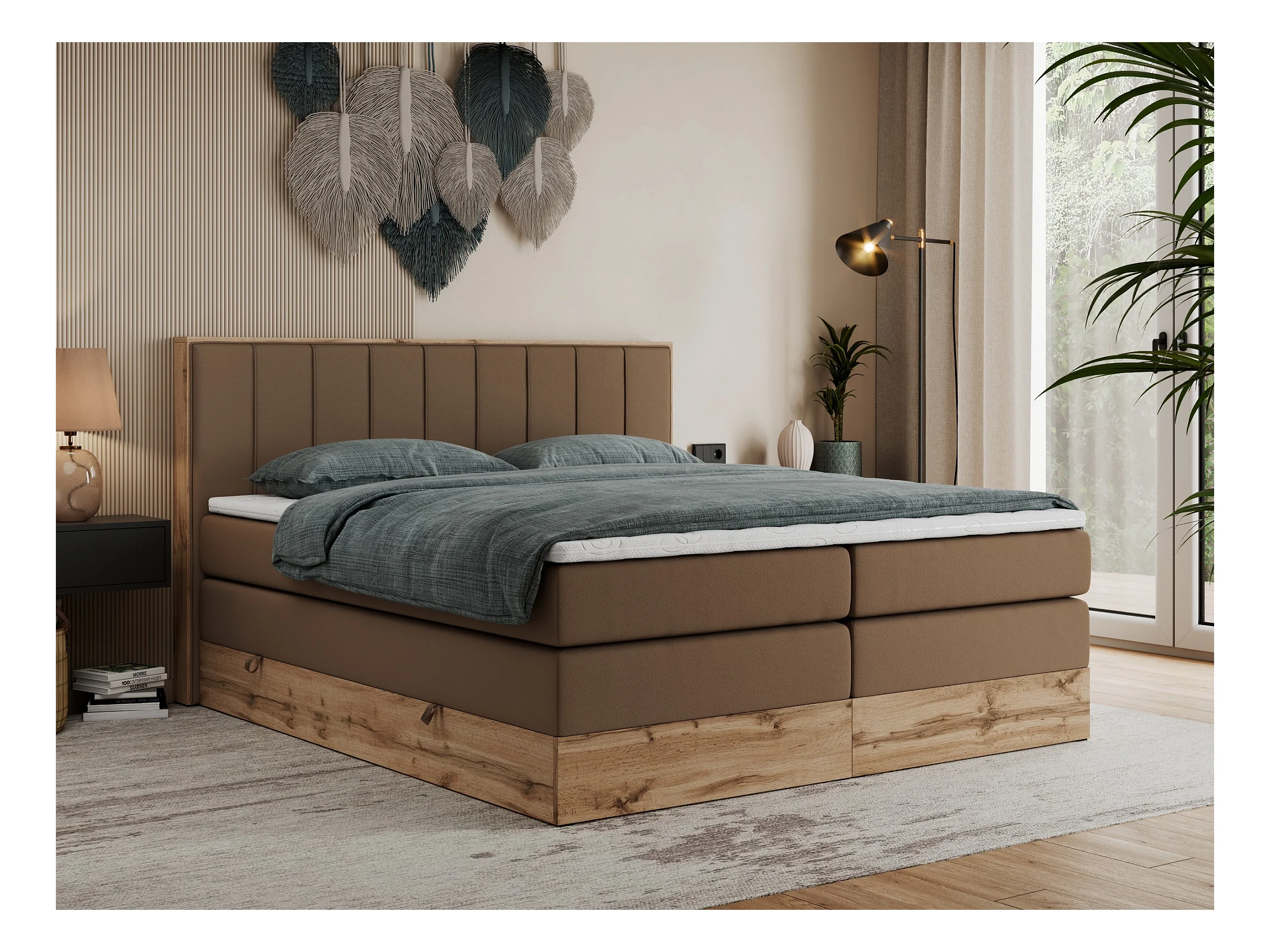 Boxspringbett BELLISSIMO KING - für Schlafzimmer, zwei Multipocket-Matratzen, Set mit Kopfteil und Topper, Holzrahmen - 200x200 cm - H3 - Braun Kunstleder
