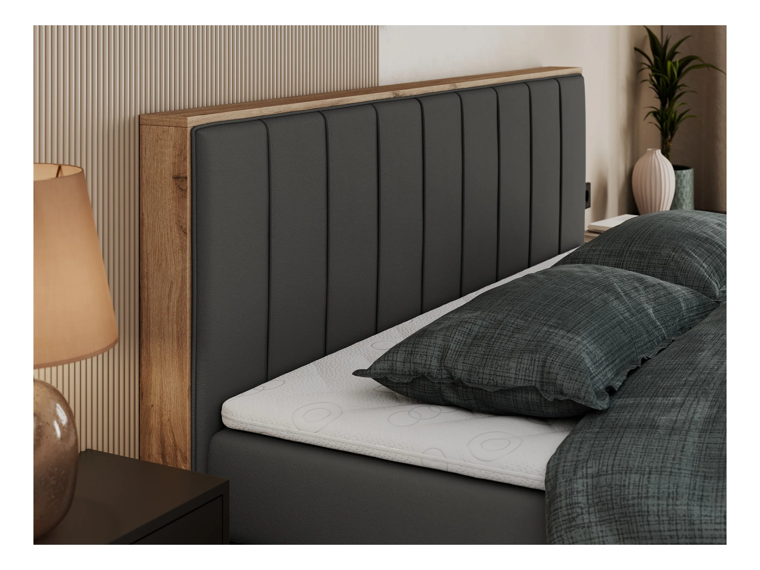 Boxspringbett BELLISSIMO KING - für Schlafzimmer, zwei Multipocket-Matratzen, Set mit Kopfteil und Topper, Holzrahmen - 200x200 cm - H3 - Dunkelgrau Kunstleder