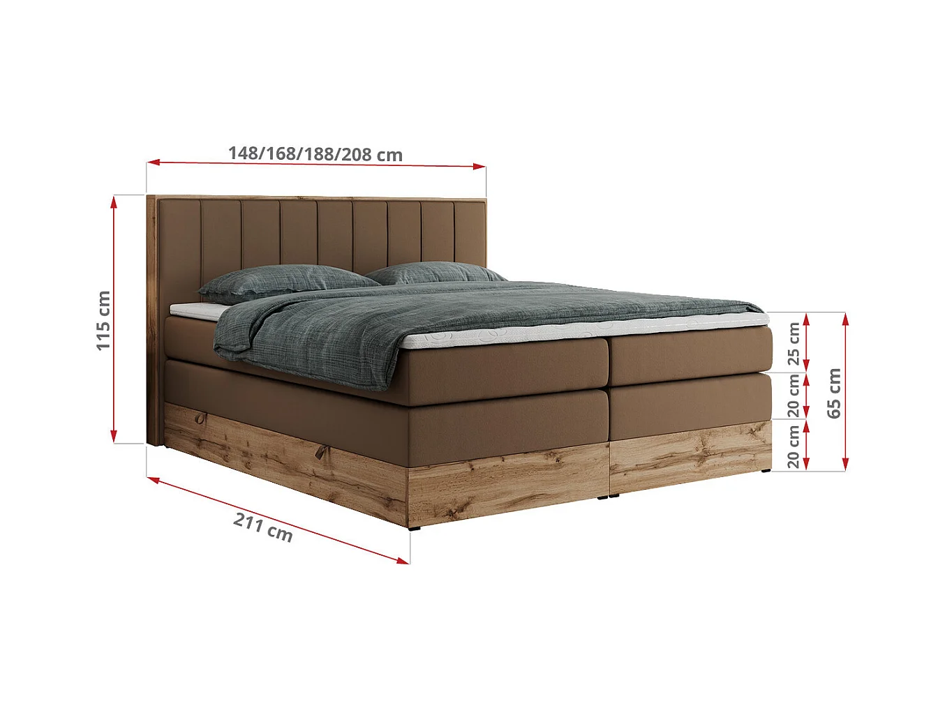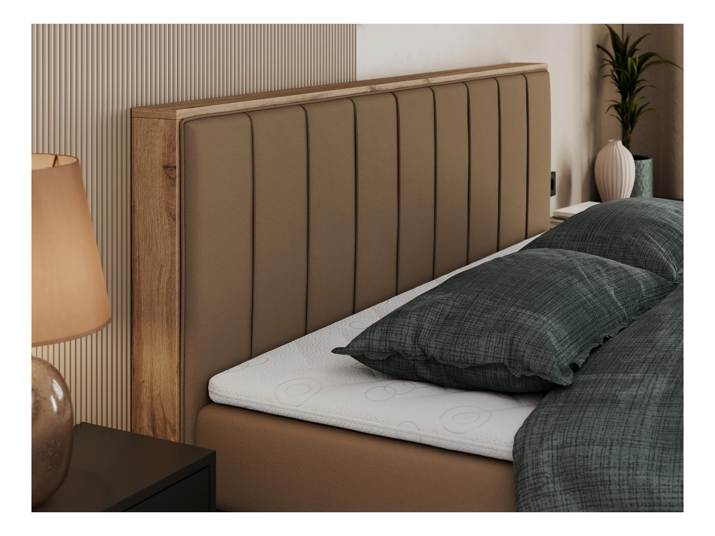 Boxspringbett BELLISSIMO KING - für Schlafzimmer, zwei Multipocket-Matratzen, Set mit Kopfteil und Topper, Holzrahmen - 200x200 cm - H4 - Braun Kunstleder