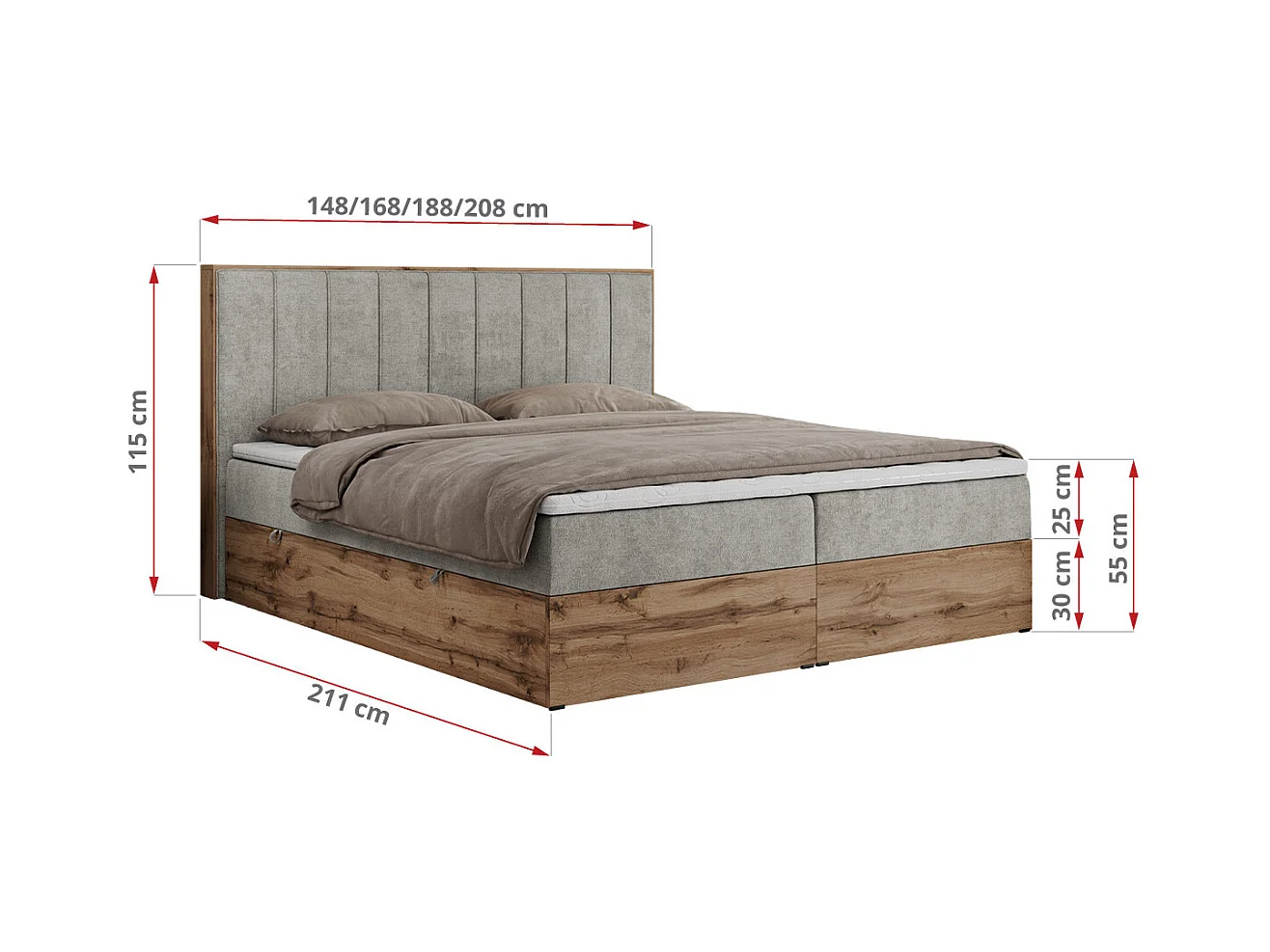 Boxspringbett BELLISSIMO - mit gestepptem Kopfteil, Polsterbett mit zwei Bettkästen, Multipocket-Matratze - 140x200 cm - H4 - Hellgrau Strukture